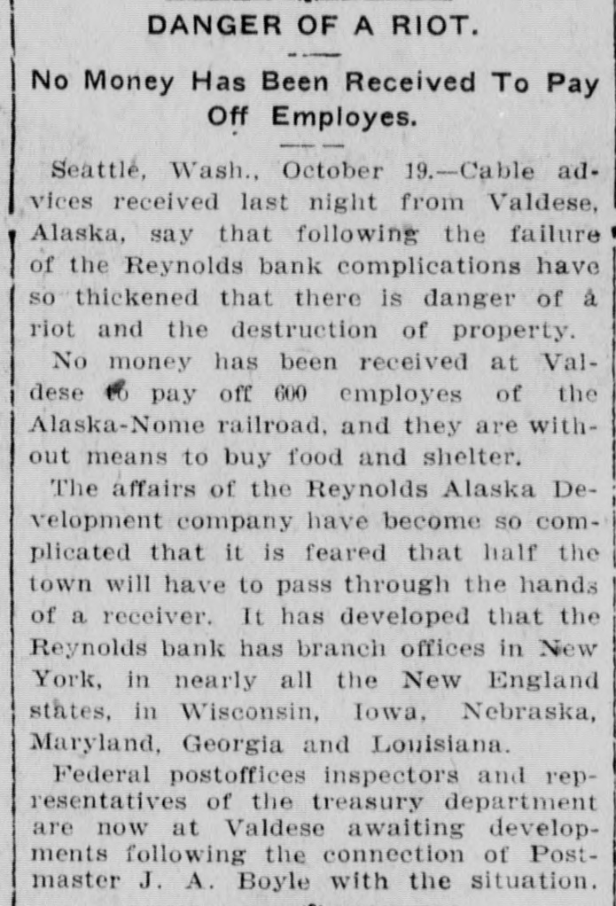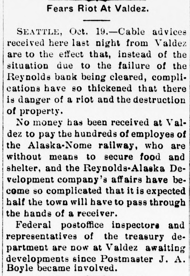 Fears Riot At Valdez. SEATTLE, Oct. 19.-Cable advices received here last night from Valdez are to the effect that, instead of the situation due to the failure of the Reynolds bank being cleared, complications have so thickened that there is danger of a riot and the destruction of property. No money has been received at Valdez to pay the hundreds of employes of the Alaska-Nome railway, who are without means to secure food and shelter, and the Reynolds-Alaska Development company's affairs have become so complicated that it is expected half the town will have to pass through the hands of a receiver. Federal postoffice inspectors and representatives of the treasury department are now at Valdez awaiting developments since Postmaster J. A. Boyle became involved.