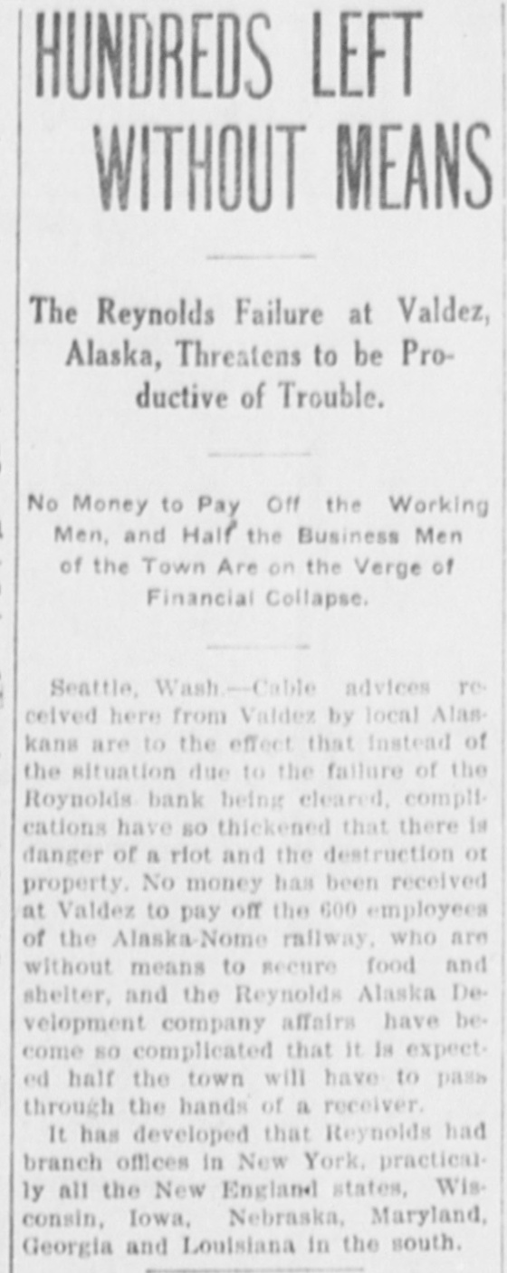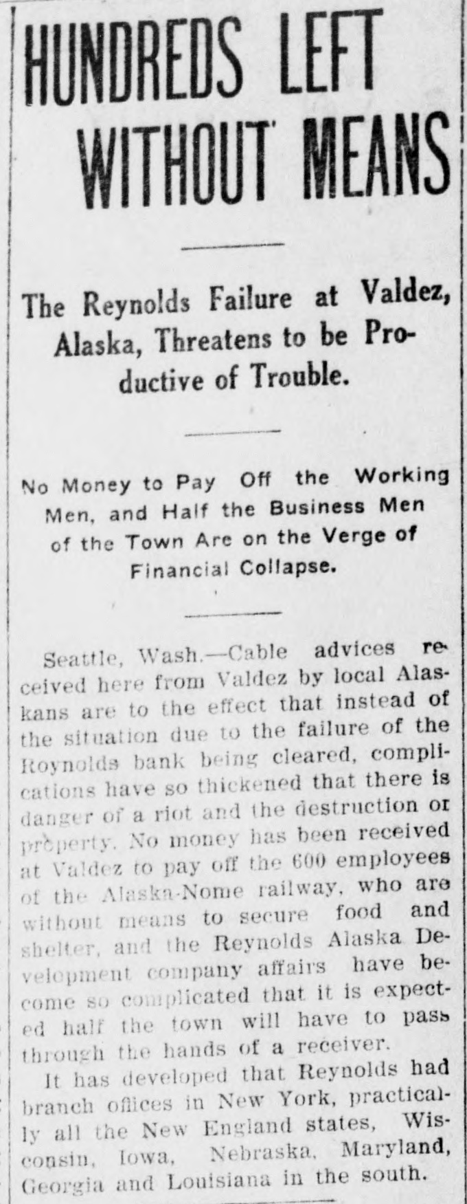 HUNDREDS LEFT WITHOUT MEANS The Reynolds Failure at Valdez, Alaska, Threatens to be Productive of Trouble. No Money to Pay Off the Working Men, and Half the Business Men of the Town Are on the Verge of Financial Collapse. Seattle, Wash.-Cable advices re ceived here from Valdez by local Alaskans are to the effect that instead of the situation due to the failure of the Roynolds bank being cleared, complications have so thickened that there is danger of a riot and the destruction or property. No money has been received at Valdez to pay off the 600 employees of the Alaska-Nome railway, who are without means to secure food and shelter, and the Reynolds Alaska Development company affairs have become so complicated that it is expected half the town will have to pass through the hands of a receiver. It has developed that Reynolds had branch offices in New York, practically all the New England states, Wisconsin, Iowa, Nebraska. Maryland, Georgia and Louisiana in the south.