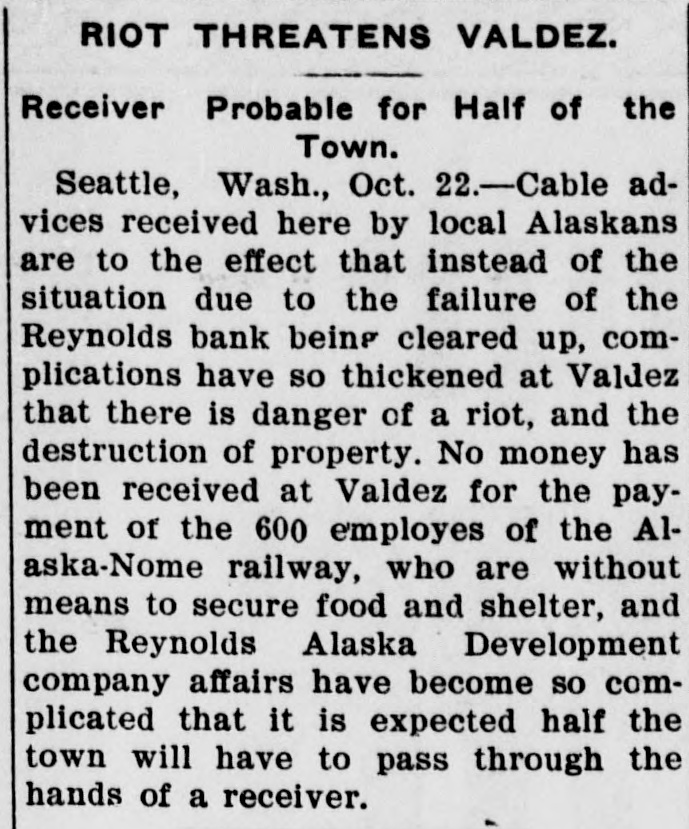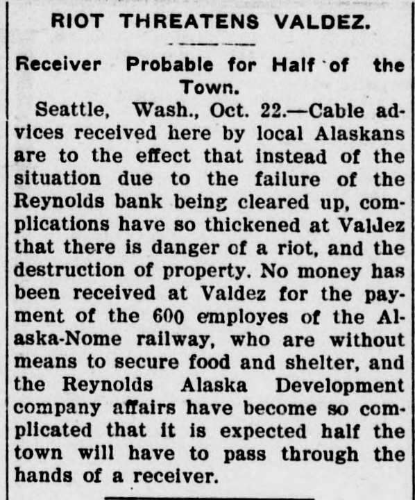 RIOT THREATENS VALDEZ. Receiver Probable for Half of the Town. Seattle, Wash., Oct. 22.-Cable advices received here by local Alaskans are to the effect that instead of the situation due to the failure of the Reynolds bank being cleared up, complications have so thickened at Valdez that there is danger of a riot, and the destruction of property. No money has been received at Valdez for the payment of the 600 employes of the Alaska-Nome railway, who are without means to secure food and shelter, and the Reynolds Alaska Development company affairs have become so complicated that it is expected half the town will have to pass through the hands of a receiver.