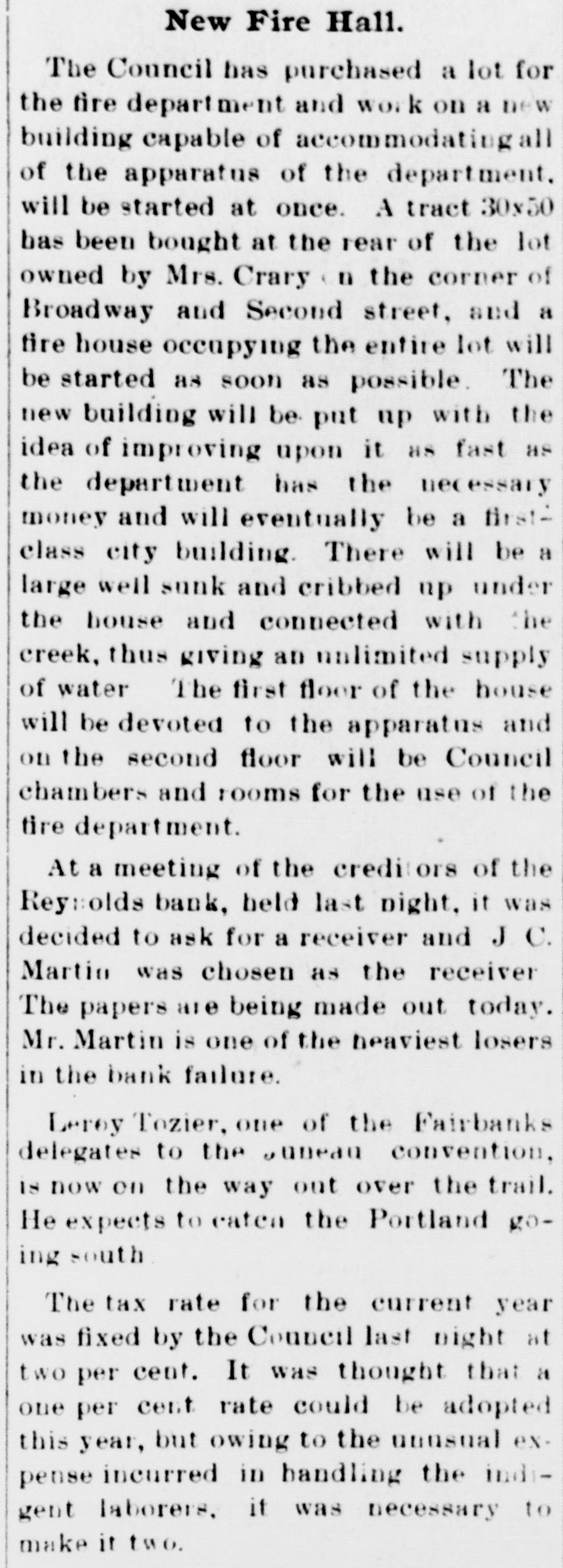 New Fire Hall. The Council has purchased a lot for the fire department and work on a new building capable of accommodating all of the apparatus of the department. will be started at once. A tract 30x50 has been bought at the rear of the lot owned by Mrs. Crary n the corner of Broadway and Second street, and a fire house occupying the entire lot will be started as soon as possible. The new building will be. put up with the idea of improving upon it HS fast as the department has the necessary money and will eventually be a firstclass city building. There will be a large well sunk and cribbed up under the bouse and connected with the creek, thus giving an unlimited supply of water The first floor of the house will be devoted to the apparatus and on the second floor will be Council chambers and rooms for the use of the tire department. At a meeting of the creditors of the Reynolds bank, held last night, it was decided to ask for a receiver and J C. Martin was chosen as the receiver The papers are being made out today. Mr. Martin is one of the heaviest losers in the bank failure. Leroy Tozier, one of the Fairbanks delegates to the Juneau convention, IS now on the way out over the trail. He expects to caten the Portland going south The tax rate for the current year was fixed by the Council last night at two per cent. It was thought that a one per cent rate could be adopted this year, but owing to the nusual expense incurred in handling the indigent laborers. it was necessary to make it two.
