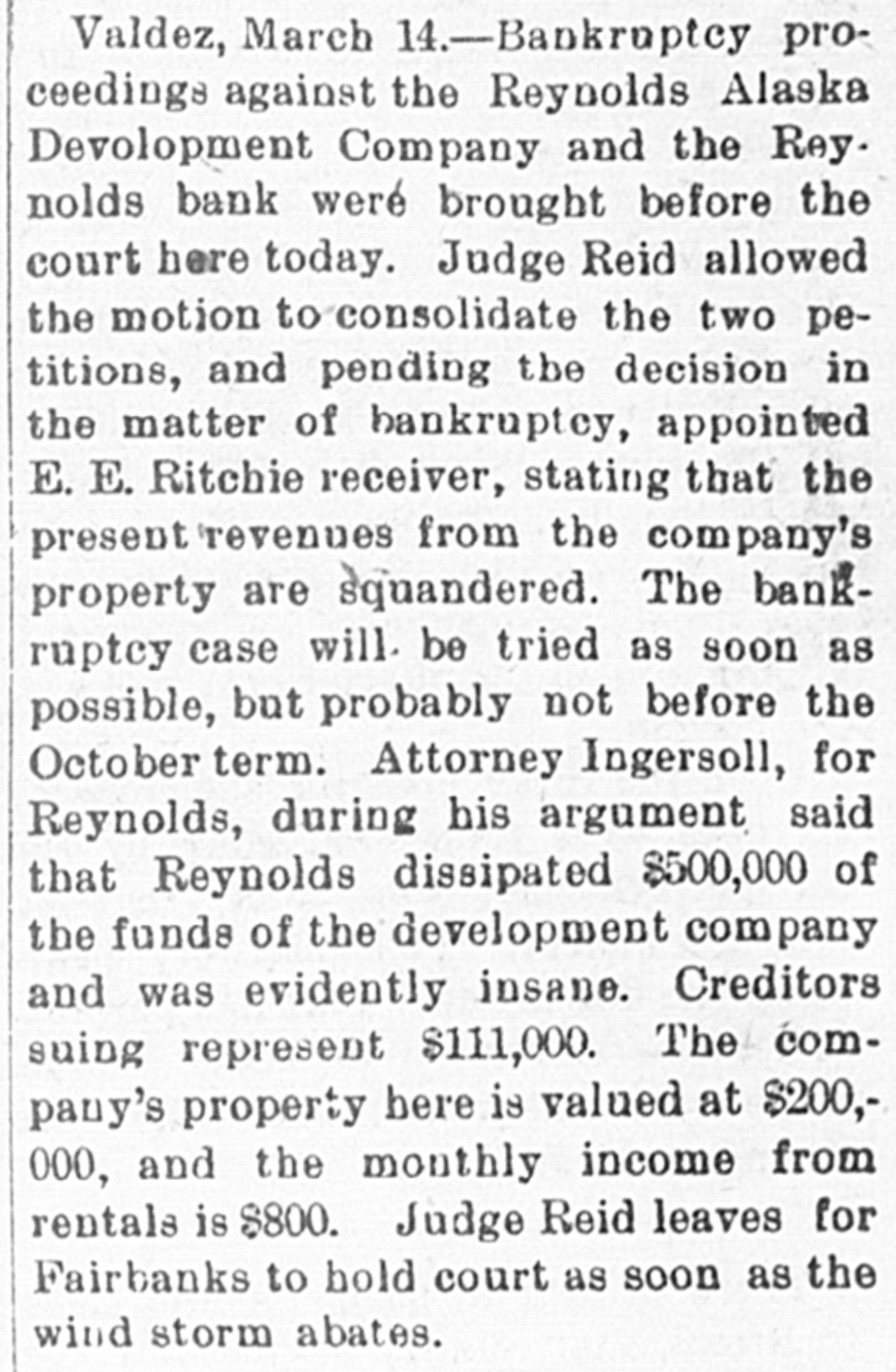 Valdez, March 14.-Bankruptcy proceedings against the Reynolds Alaska Devolopment Company and the Rey. nolds bank were brought before the court here today. Judge Reid allowed the motion to consolidate the two petitions, and pending the decision in the matter of bankruptcy, appointed E. E. Ritchie receiver, stating that the present/revenues from the company's property are squandered. The bankruptcy case will. be tried as soon as possible, but probably not before the October term. Attorney Ingersoll, for Reynolds, during his argument said that Reynolds dissipated $500,000 of the funds of the development company and was evidently insane. Creditors suing represent $111,000. The company's property here is valued at $200,000, and the monthly income from rentals is $800. Judge Reid leaves for Fairbanks to hold court as soon as the wind storm abates.