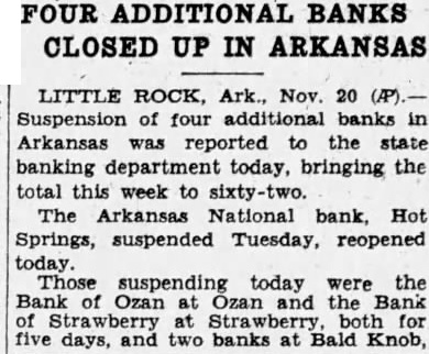 FOUR BANKS CLOSED UP IN ARKANSAS LITTLE ROCK, Ark., Nov. 20 Suspension of four additional banks in Arkansas reported the state banking department today, bringing the total this week to The Arkansas National bank, Hot Springs, suspended Tuesday, reopened today Those suspending today were the Ozan Ozan and the Strawberry Strawberry both days, and two banks at Bald Knob,