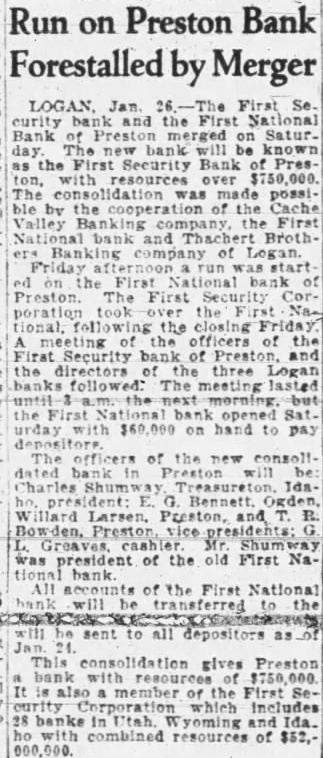 Run on Preston Bank Forestalled by Merger LOGAN. Jan. The First Se. and the First National Bank Preston merged day. The bank be known the First Security Bank Pres. with over The consolidation was possiby the of the Cache Valley the First Broth First bank Preston First poration the wing the of First Security of the directors Logan followed: The meeting lasted Sat on hand to pay officers of the new W Larsen, and Shumway was president of the old First Nabank All of the First National be transferred will all depositors as This consolidation gives It the First Sewhich banks Wyoming and Ida. ho with combined resources of $52, 000,000.