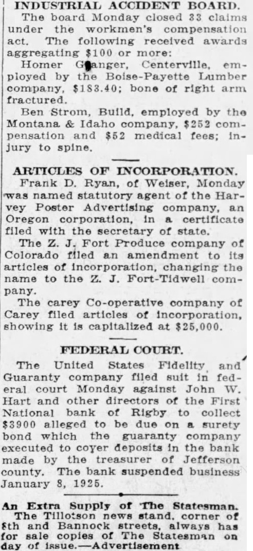 Idaho News BOISE.-Boise's per capita fire loss during 1924, judging by estimate of what the final report will show, will be 500 to 600 per cent greater than in 1923. The loss last year was from $8 to $10 per capita as compared with less than $1 the preceding years. LEWISTON.-Mrs. E. Greeman of this city has a Rhode Island Red hen that hatched 11 baby chicks on New Year's Day. The hen hatched all the eggs but one, notwithstanding the fact that the eggs were under her during the recent zero weather. The chicks are all living and doing nicely. COEUR D'ALENE. - A statement by the geological survey shows that the Coeur d'Alene district in Idaho was the second largest lead producer in the United States in 1924, its total lead output for the year being estimated at 128,000 tons. Missouri alone produced more lead than Idaho, with Utah third. MOSCOW.-More than 50 Camp Fire Girls of Moscow plan* to attend summer camp at Sweyolakan on Lake Coeur d'Alene next summer, according to information brought back to Spokane by Miss Annette Francisco. executive secretary. Miss Francisco spoke at a mothers' and daughters banquet held in Eagles Hall recently. She was awarded the rank of torchbearer to 10 girls, the same ones who were given the firemakers' rank two years ago. "Camp Fire is growing fast in Moscow," said Miss Francisco "Five groups with a membership of more than 100 are now operating. The Rotary Club of Moscow is sponsoring the movement." LEWISTON-The increase in cream production in the Central Idaho region and the consequent increase in dairying, may be realized from the recent report of the Mutual Creamery Company of Lewiston, which shows an increase the past year of 63½ per cent. What it means to the farmor and dairymen may be understood when it is learned that the local creamery produced 500,000 pounds of butter, using 400,000 pounds of butterfat, which at the average price of 37 cents totaled $150,000 paid to farmers for cream. Beside this the creamery in its production of 25,000 gallons of ice cream used 20,000 pounds of but terfat, giving the producers in this district $7,500 more. The butter, if all shipped out of Lewiston, would amount to 26 cars or better than two a month. Over half of the butter manufactured in Dewiston is used locally and in the immediate territory, the rest being sold through the branch plants at Los Angeles, Portland and Seattle. POCATELLO.-The First National Bank of Rigby failed to open its doors recently, according to word received here, and the institution is in the hands of the state bank examiner. Recent heavy withdrawals was declared in a statement to depositors to have been the reason for closing. The bank claimed deposits of around $500,000. BOISE.-Clinton H. Hartson, collector of customs at Seattle, Wash., and former resident of Spokane, has been appointed by Governor C. C. Moore to the Third judicial district bench at Boise. He succeeds Raymond L. Givens, resigned to go on the state supreme bench.