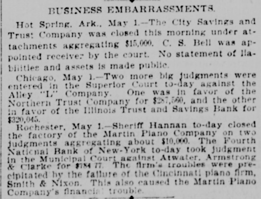 BUSINESS EMBARRASSMENTS Hot Spring. Ark., May 1.--The City Savings and Trust Company was closed this morning under attachments aggregating $15,000. C. S. Bell was appointed receiver by the court. No statement of llabilities and assets is made public. Chicago, May 1.-Two more big judgments were entered in the Superior Court to-day against the Alley "L" Company One was in favor of the Northern Trust Company for $287,560. and the other in favor of the Illinois Trust and Savings Bank for $320,045. Rochester, May 1.-Sheriff Hannan to-day closed the factory of the Martin Plano Company on two judgments aggregating about $10,000. The Fourth National Bank of New-York to-day took judgment in the Municipal Court against Atwater, Armstrong & Clarke for $784 77. The firm's troubles were precipitated by the failure of the Cincinnati plano firm, Smith & Nixon. This also caused the Martin Piano Company's financial trouble.