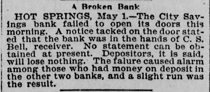 A Broken Bank HOT SPRINGS, May 1.-The City Savings bank failed to open its doors this morning. A notice tacked on the door stated that the bank was in the hands of C. S. Bell, receiver. No statement can be obtained at present. Depositors, it is said, will lose nothing. The falure caused alarm among those who had money on deposit in the other two banks, and a slight run was the result.