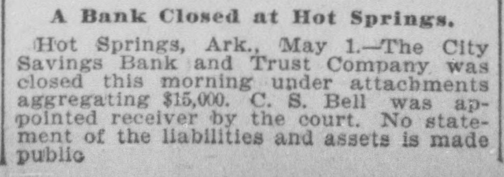 A Bank Closed at Hot Springs. Hot Springs, Ark., May 1.-The City Savings Bank and Trust Company was closed this morning under attachments aggregating $15,000. C. S. Bell was appointed receiver by the court. No statement of the liabilities and assets is made public