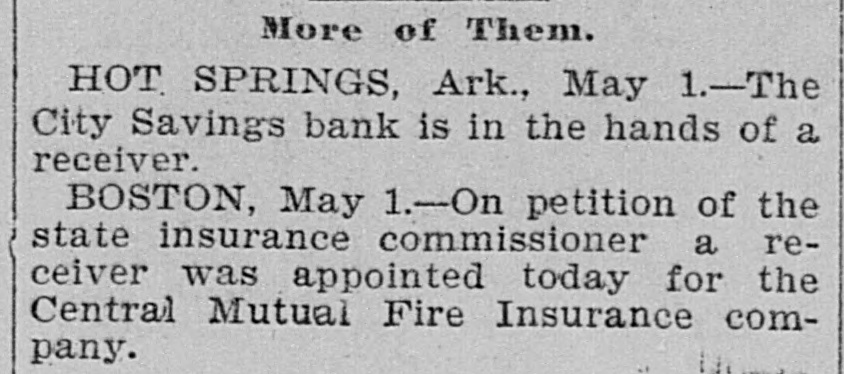 More of Them. HOT SPRINGS, Ark., May 1.-The City Savings bank is in the hands of a receiver. BOSTON, May 1.-On petition of the state insurance commissioner a receiver was appointed today for the Central Mutual Fire Insurance company.