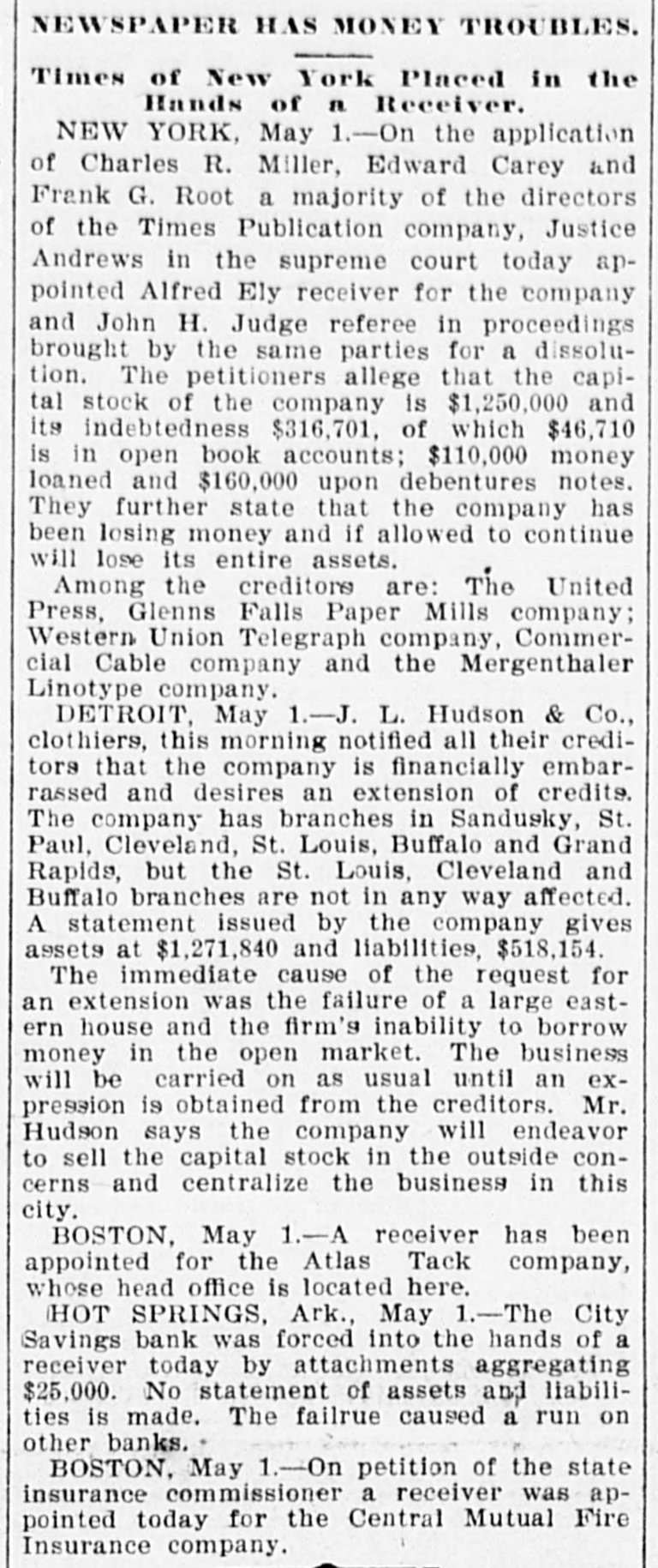 NEWSPAPER HAS MONEY TROUBLES. Times of New York Placed in the Hands of a Receiver. NEW YORK, May 1.-On the application of Charles R. Miller, Edward Carey and Frank G. Root a majority of the directors of the Times Publication company, Justice Andrews in the supreme court today appointed Alfred Ely receiver for the company and John H. Judge referee in proceedings brought by the same parties for a dissolution. The petitioners allege that the capital stock of the company is $1,250,000 and its indebtedness $316,701, of which $46,710 is in open book accounts; $110,000 money loaned and $160,000 upon debentures notes. They further state that the company has been losing money and if allowed to continue will lose its entire assets. Among the creditors are: The United Press, Glenns Falls Paper Mills company; Western Union Telegraph company, Commercial Cable company and the Mergenthaler Linotype company. DETROIT, May 1.-J. L. Hudson & Co., clothiers, this morning notified all their creditors that the company is financially embarrassed and desires an extension of credits. The company has branches in Sandusky, St. Paul, Cleveland, St. Louis, Buffalo and Grand Rapids, but the St. Louis, Cleveland and Buffalo branches are not in any way affected. A statement issued by the company gives assets at $1,271,840 and liabilities, $518,154. The immediate cause of the request for an extension was the failure of a large eastern house and the firm's inability to borrow money in the open market. The business will be carried on as usual until an expression is obtained from the creditors. Mr. Hudson says the company will endeavor to sell the capital stock in the outside concerns and centralize the business in this city. BOSTON, May 1.-A receiver has been appointed for the Atlas Tack company, whose head office is located here. HOT SPRINGS, Ark., May 1.-The City Savings bank was forced into the hands of a receiver today by attachments aggregating $25,000. No statement of assets and liabilities is made. The failrue caused a run on other banks. BOSTON, May 1.-On petition of the state insurance commissioner a receiver was appointed today for the Central Mutual Fire Insurance company.