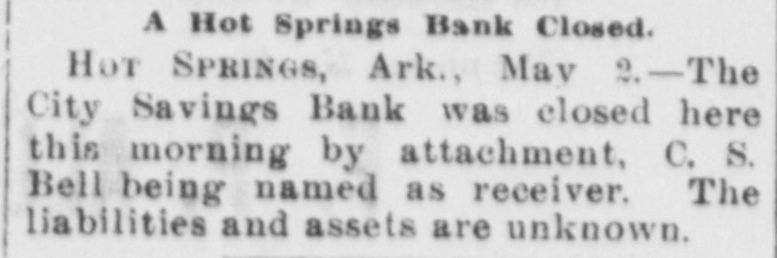 A Hot Springs Bank Closed. HOT SPRINGS, Ark., May 2.-The City Savings Bank was closed here this morning by attachment, C. S. Bell being named as receiver. The liabilities and assets are unknown.