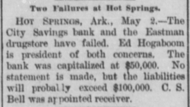 Two Failures at Hot Springs. Hor SPRINGS, Ark., May 2.-The City Savings bank and the Eastman drugstore have failed. Ed Hogaboom is president of both concerns. The bank was capitalized at $50,000. No statement is made, but the liabilities will probally exceed $100,000. C.S. Bell was appointed receiver.
