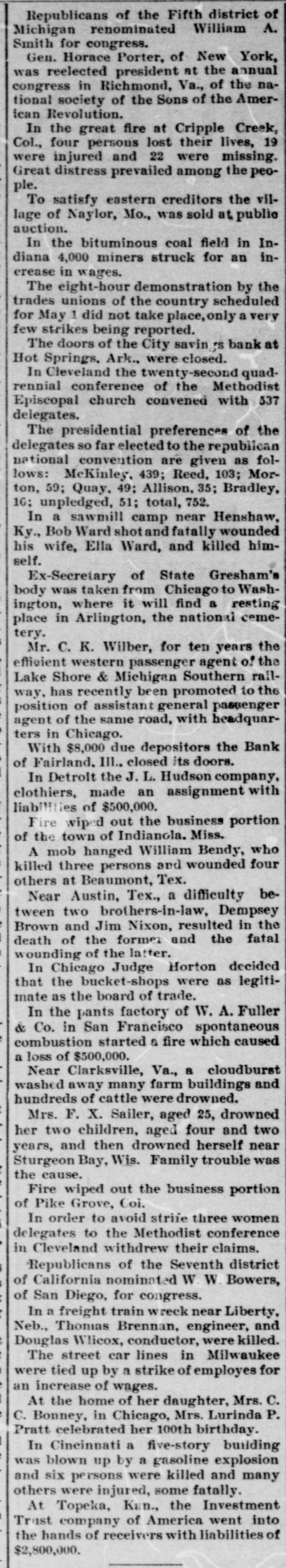 Republicans of the Fifth district of Michigan renominated William A. Smith for congress. Gen. Horace Porter, of New York, was reelected president at the annual congress in Richmond, Va., of the national society of the Sons of the American Revolution. In the great fire at Cripple Creek, Col., four persons lost their lives, 19 were injured and 22 were missing. Great distress prevailed among the people. To satisfy eastern creditors the village of Naylor, Mo., was sold at public auction. In the bituminous coal field in Indiana 4,000 miners struck for an increase in wages. The eight-hour demonstration by the trades unions of the country scheduled for May 1 did not take place, only a very few strikes being reported. The doors of the City savin 'S bank at Hot Springs, Ark., were closed. In Cleveland the twenty-second quadrennial conference of the Methodist Episcopal church convened with 537 delegates. The presidential preferences of the delegates so far elected to the republican national convention are given as follows: McKinley, 439; Reed, 103; Morton, 59; Quay, 49; Allison, 35; Bradley, 10; unpledged, 51; total, 752. In a sawmill camp near Henshaw, Ky., Bob Ward shot and fatally wounded his wife, Ella Ward, and killed himself. Ex-Secretary of State Gresham's body was taken from Chicago to Washington, where it will find a resting place in Arlington, the national cemetery. Mr. C. K. Wilber, for ten years the efficient western passenger agent of the Lake Shore & Michigan Southern railway, has recently been promoted to the position of assistant general passenger agent of the same road, with headquarters in Chicago. With $8,000 due depositors the Bank of Fairland. III., closed its doors. In Detroit the J. L. Hudson company, clothiers, made an assignment with liabilities of $500,000. Fire wiped out the business portion of the town of Indianola. Miss. A mob hanged William Bendy, who killed three persons and wounded four others at Beaumont, Tex. Near Austin, Tex., a difficulty between two brothers-in-law, Dempsey Brown and Jim Nixon, resulted in the death of the former and the fatal wounding of the latter. In Chicago Judge Horton decided that the bucket-shops were as legitimate as the board of trade. In the pants factory of W. A. Fuller & Co. in San Francisco spontaneous combustion started a fire which caused a loss of $500,000. Near Clarksville, Va., a cloudburst washed away many farm buildings and hundreds of cattle were drowned. Mrs. F. X. Sailer, aged 25, drowned her two children, aged four and two years, and then drowned herself near Sturgeon Bay, Wis. Family trouble was the cause. Fire wiped out the business portion of Pike Grove, Col. In order to avoid strife three women delegates to the Methodist conference in Cleveland withdrew their claims. Republicans of the Seventh district of California nominated W. W. Bowers, of San Diego, for congress. In a freight train wreck near Liberty, Neb., Thomas Brennan, engineer, and Douglas Wlicox, conductor, were killed. The street car lines in Milwaukee were tied up by a strike of employes for an increase of wages. At the home of her daughter, Mrs. C. C. Bonney, in Chicago, Mrs. Lurinda P. Pratt celebrated her 100th birthday. In Cincinnati a five-story building was blown up by a gasoline explosion and six persons were killed and many others were injured, some fatally. At Topeka, Kan., the Investment