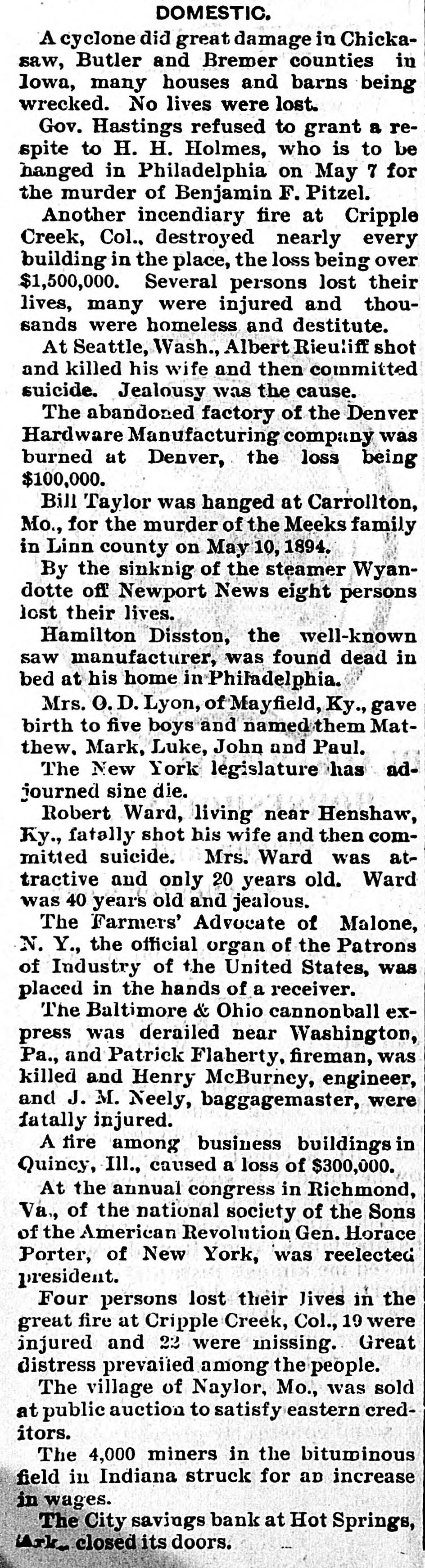 DOMESTIC. A cyclone did great damage in Chickasaw, Butler and Bremer counties in lowa, many houses and barns being wrecked. No lives were lost. Gov. Hastings refused to grant a respite to H. H. Holmes, who is to be hanged in Philadelphia on May 7 for the murder of Benjamin F. Pitzel. Another incendiary fire at Cripple Creek, Col., destroyed nearly every building in the place, the loss being over $1,500,000. Several persons lost their lives, many were injured and thousands were homeless and destitute. At Seattle, Wash., Albert Rieuliff shot and killed his wife and then committed suicide. Jealousy was the cause. The abandoned factory of the Denver Hardware Manufacturing company was burned at Denver, the loss being $100,000. Bill Taylor was hanged at Carrollton, Mo., for the murder of the Meeks family in Linn county on May 10, 1894. By the sinknig of the steamer Wyandotte off Newport News eight persons lost their lives. Hamilton Disston, the well-known saw manufacturer, was found dead in bed at his home in Philadelphia. Mrs. O. D. Lyon, of Mayfield, Ky., gave birth to five boys and named them Matthew. Mark, Luke, John and Paul. The New York legislature has adjourned sine die. Robert Ward, living near Henshaw, Ky., fatally shot his wife and then committed suicide. Mrs. Ward was attractive and only 20 years old. Ward was 40 years old and jealous. The Farmers' Advocate of Malone, N. Y., the official organ of the Patrons of Industry of the United States, was placed in the hands of a receiver. The Baltimore & Ohio cannonball express was derailed near Washington, Pa., and Patrick Flaherty, fireman, was killed and Henry McBurney, engineer, and J. M. Neely, baggagemaster, were fatally injured. A fire among business buildings in Quincy, Ill., caused a loss of $300,000. At the annual congress in Richmond, Va, of the national society of the Sons of the American Revolution Gen. Horace Porter, of New York, was reelected president. Four persons lost their lives in the great fire at Cripple Creek, Col., 19 were injured and 22 were missing. Great distress prevailed among the people. The village of Naylor, Mo., was sold at public auction to satisfy eastern creditors. The 4,000 miners in the bituminous field in Indiana struck for an increase in wages. The City savings bank at Hot Springs, (Ark. closed its doors.