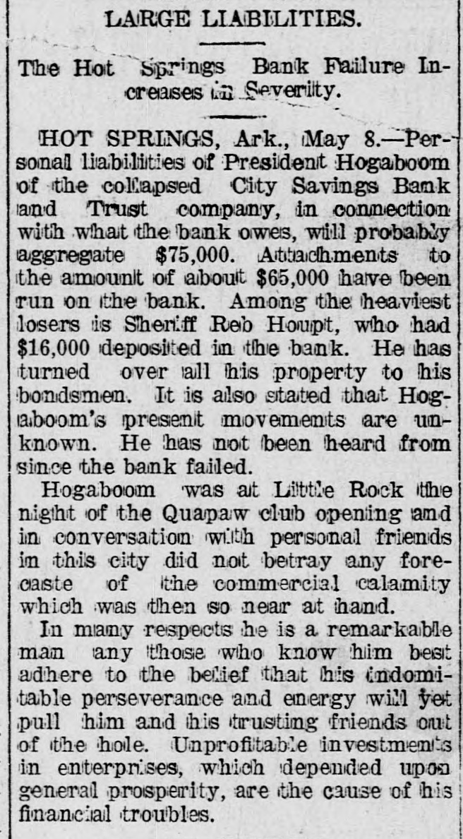 LARGE LIABILITIES. The Hot Springs Bank Failure Incr reases Kn Severity. / HOT SPRINGS, Ark., May 8.-Personal liabilities of President Hogaboom of the collapsed City Savings Bank and Trust company, in connection with what the bank owes, will probably aggregate $75,000. Attachments to the amount of about $65,000 have been run on the bank. Among the heaviest losers is Sheriff Reb Houpt, who had $16,000 deposited in the bank. He has turned over all this property to his bondsmen. It is also stated that Hogaboom's present movements are unknown. He has not been heard from since the bank failed. Hogaboom was ait Little Rock the night of the Quapaw club opening and in conversation with personal friends in this city did not betray any forecaste of the commercial calamity which was then SO near at hand. In many respects he is a remarkable man any those who know him best adhere to the belief that his indomitable perseverance and energy will yet pull him and this trusting friends out of the hole. Unprofitable investments in enterprises, which depended upon general prosperity, are the cause of his financial troubles.