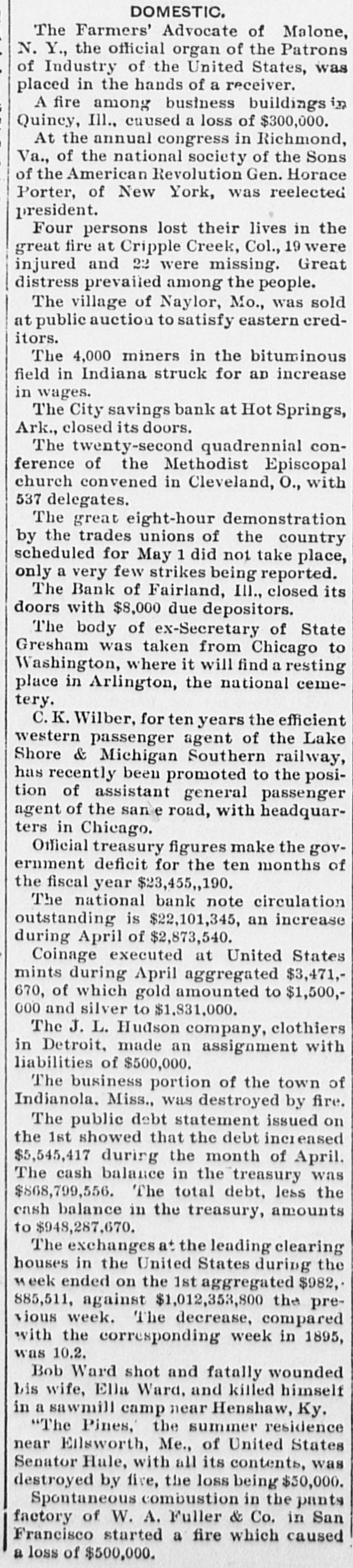 DOMESTIC. The Farmers' Advocate of Malone, N. Y., the official organ of the Patrons of Industry of the United States, was placed in the hands of a receiver. A fire among business buildings in Quincy, Ill., caused a loss of $300,000. At the annual congress in Richmond, Va., of the national society of the Sons of the American Revolution Gen. Horace Porter, of New York, was reelected president. Four persons lost their lives in the great fire at Cripple Creek, Col., 19 were injured and 22 were missing. Great distress prevailed among the people. The village of Naylor, Mo., was sold at public auction to satisfy eastern creditors. The 4,000 miners in the bituminous field in Indiana struck for an increase in wages. The City savings bank at Hot Springs, Ark., closed its doors. The twenty-second quadrennial conference of the Methodist Episcopal church convened in Cleveland, O., with 537 delegates. The great eight-hour demonstration by the trades unions of the country scheduled for May 1 did not take place, only a very few strikes being reported. The Bank of Fairland, III., closed its doors with $8,000 due depositors. The body of ex-Secretary of State Gresham was taken from Chicago to Washington, where it will find a resting place in Arlington, the national cemetery. C.K. Wilber, for ten years the efficient western passenger agent of the Lake Shore & Michigan Southern railway, has recently been promoted to the position of assistant general passenger agent of the sane road, with headquarters in Chicago. Official treasury figures make the government deficit for the ten months of the fiscal year $23,455,190. The national bank note circulation outstanding is $22,101,345, an increase during April of $2,873,540. Coinage executed at United States mints during April aggregated $3,471,670, of which gold amounted to $1,500,000 and silver to $1,831,000. The J. L. Hudson company, clothiers in Detroit, made an assignment with liabilities of $500,000. The business portion of the town of Indianola. Miss., was destroyed by fire. The public debt statement issued on the 1st showed that the debt increased $5,545,417 during the month of April. The cash balance in the treasury was $868,799,556. The total debt, less the cash balance in the treasury, amounts to $948,287,670. The exchanges at the leading clearing houses in the United States during the week ended on the 1st aggregated $982, 885,511, against $1,012,353,800 the previous week. The decrease, compared with the corresponding week in 1895, was 10.2. Bob Ward shot and fatally wounded his wife, Ella Ward, and killed himself in a sawnill camp near Henshaw, Ky. "The Pines, the summer residence near Eilsworth, Me., of United States Senator Hale, with all its contents, was destroyed by five, the loss being $30,000. Spontaneous combustion in the pants factory of W. A. Fuller & Co. in San Francisco started a fire which caused a loss of $500,000.