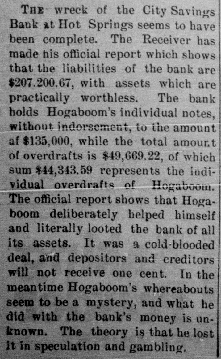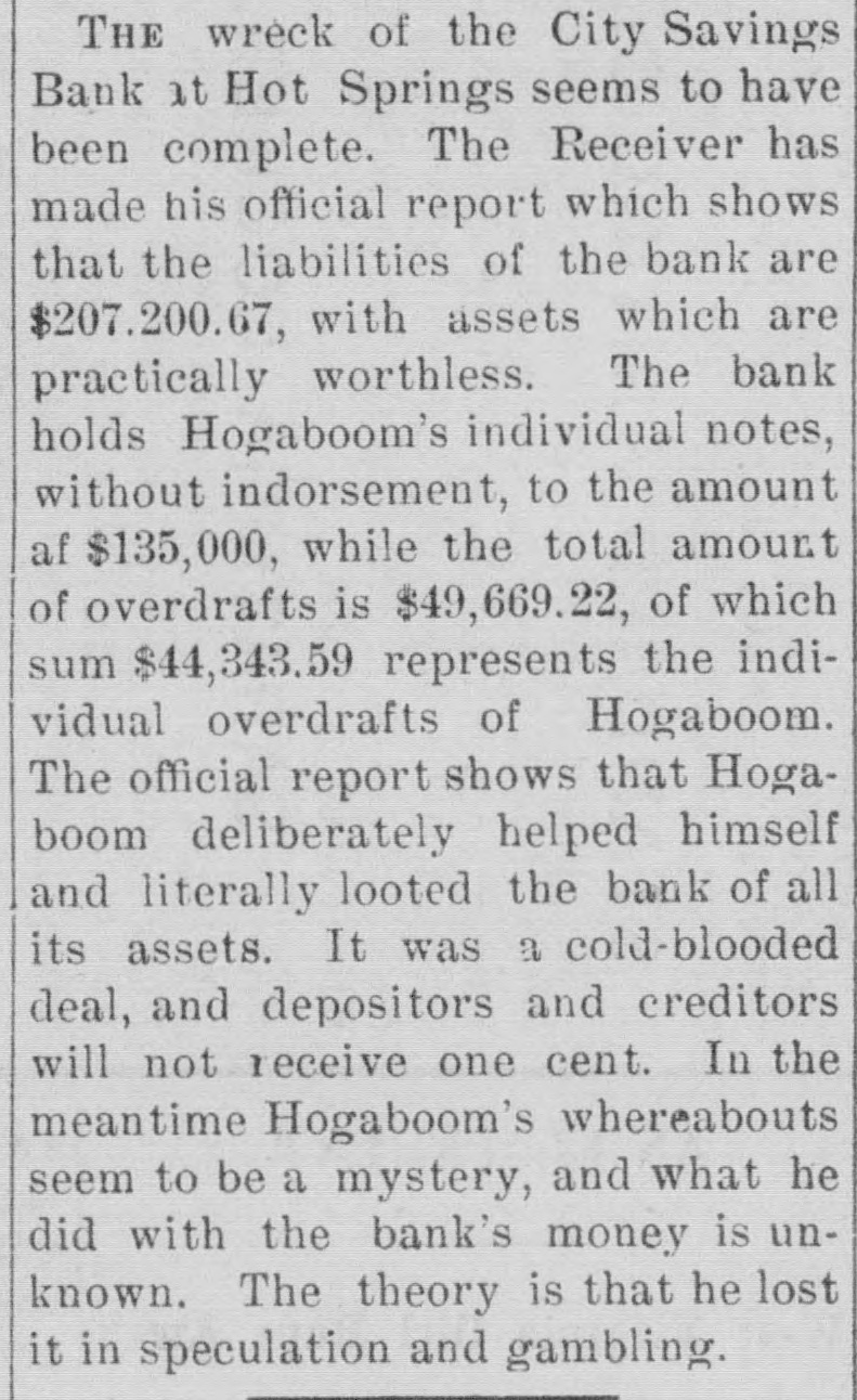 THE wreck of the City Savings Bank at Hot Springs seems to have been complete. The Receiver has made his official report which shows that the liabilities of the bank are $207.200.67, with assets which are practically worthless. The bank holds Hogaboom's individual notes, without indorsement, to the amount af $135,000, while the total amount of overdrafts is $49,669.22, of which sum $44,343.59 represents the Individual overdrafts of Hogaboom. The official report shows that Hogaboom deliberately helped himself and literally looted the bank of all its assets. It was a cold-blooded deal, and depositors and creditors will not receive one cent. In the meantime Hogaboom's whereabouts seem to be a mystery, and what he did with the bank's money is unknown. The theory is that he lost it in speculation and gambling.