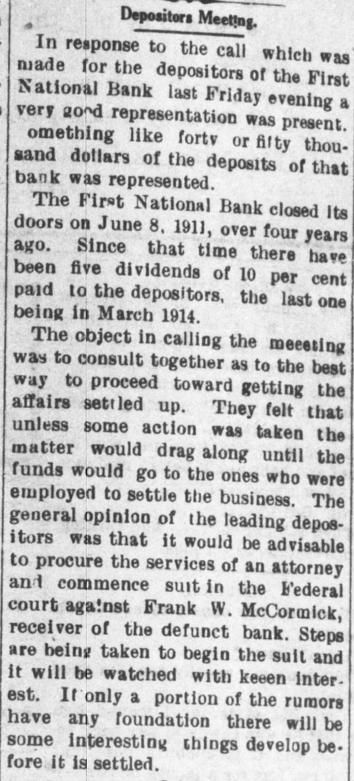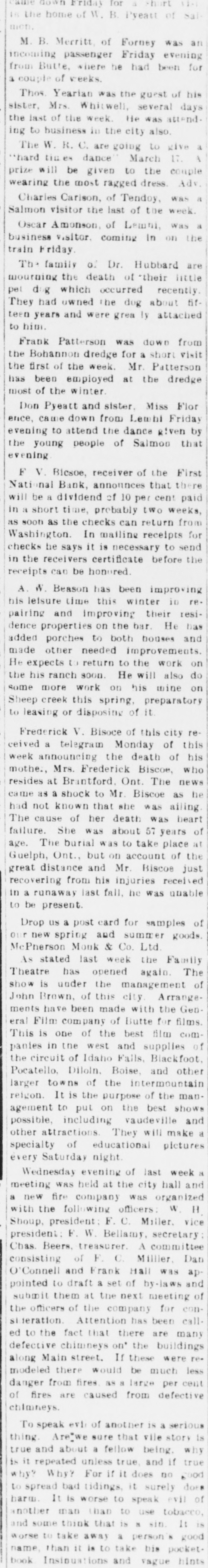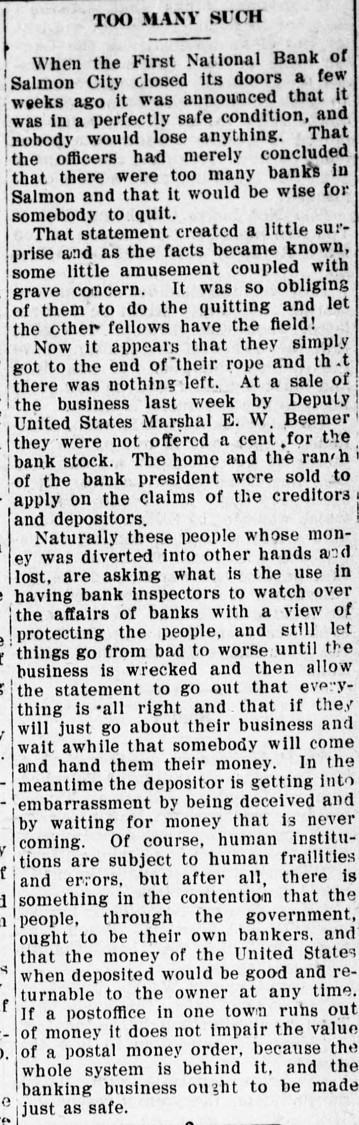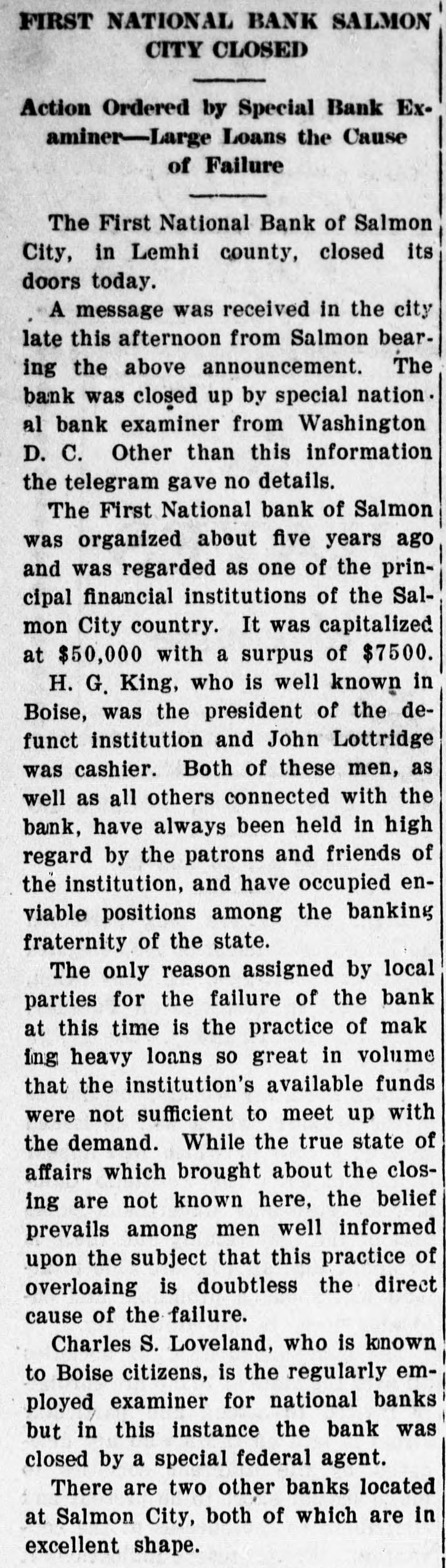 FIRST NATIONAL BANK SALMON CITY CLOSED Action Ordered by Special Bank Examiner-Large Loans the Cause of Failure The First National Bank of Salmon City, in Lemhi county, closed its doors today. A message was received in the city late this afternoon from Salmon bearing the above announcement. The bank was closed up by special nation al bank examiner from Washington D. C. Other than this information the telegram gave no details. The First National bank of Salmon was organized about five years ago and was regarded as one of the principal financial institutions of the Salmon City country. It was capitalized at $50,000 with a surpus of $7500. H. G. King, who is well known in Boise, was the president of the defunct institution and John Lottridge was cashier. Both of these men, as well as all others connected with the bank, have always been held in high regard by the patrons and friends of the institution, and have occupied enviable positions among the banking fraternity of the state. The only reason assigned by local parties for the failure of the bank at this time is the practice of mak ing heavy loans so great in volume that the institution's available funds were not sufficient to meet up with the demand. While the true state of affairs which brought about the closing are not known here, the belief prevails among men well informed upon the subject that this practice of overloaing is doubtless the direct cause of the failure. Charles S. Loveland, who is known to Boise citizens, is the regularly employed examiner for national banks but in this instance the bank was closed by a special federal agent. There are two other banks located at Salmon City, both of which are in excellent shape.