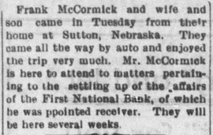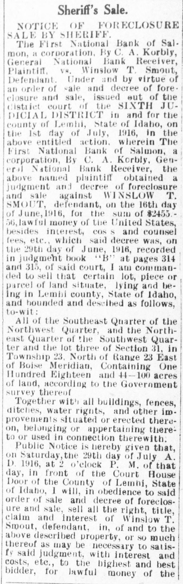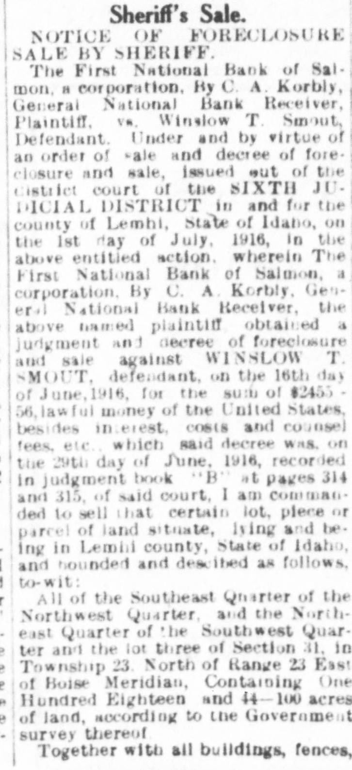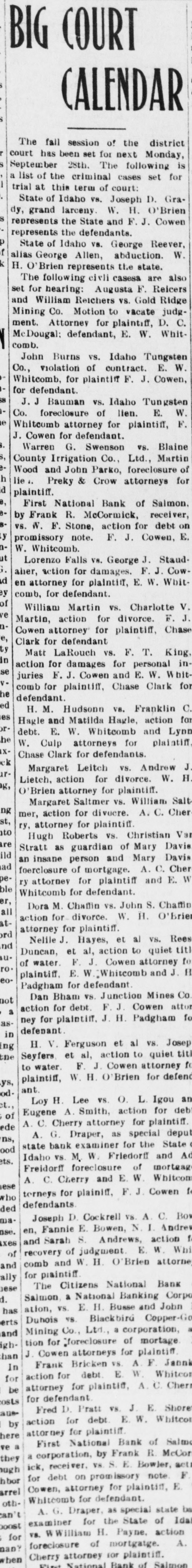FIRST NATIONAL BANK SALMON CITY CLOSED Action Ordered by Special Bank Examiner-Large Loans the Cause of Failure The First National Bank of Salmon City, in Lemhi county, closed its doors today. A message was received in the city late this afternoon from Salmon bearing the above announcement. The bank was closed up by special nation al bank examiner from Washington D. C. Other than this information the telegram gave no details. The First National bank of Salmon was organized about five years ago and was regarded as one of the principal financial institutions of the Salmon City country. It was capitalized at $50,000 with a surpus of $7500. H. G. King, who is well known in Boise, was the president of the defunct institution and John Lottridge was cashier. Both of these men, as well as all others connected with the bank, have always been held in high regard by the patrons and friends of the institution, and have occupied enviable positions among the banking fraternity of the state. The only reason assigned by local parties for the failure of the bank at this time is the practice of mak ing heavy loans so great in volume that the institution's available funds were not sufficient to meet up with the demand. While the true state of affairs which brought about the closing are not known here, the belief prevails among men well informed upon the subject that this practice of overloaing is doubtless the direct cause of the failure. Charles S. Loveland, who is known to Boise citizens, is the regularly employed examiner for national banks but in this instance the bank was closed by a special federal agent. There are two other banks located at Salmon City, both of which are in excellent shape.