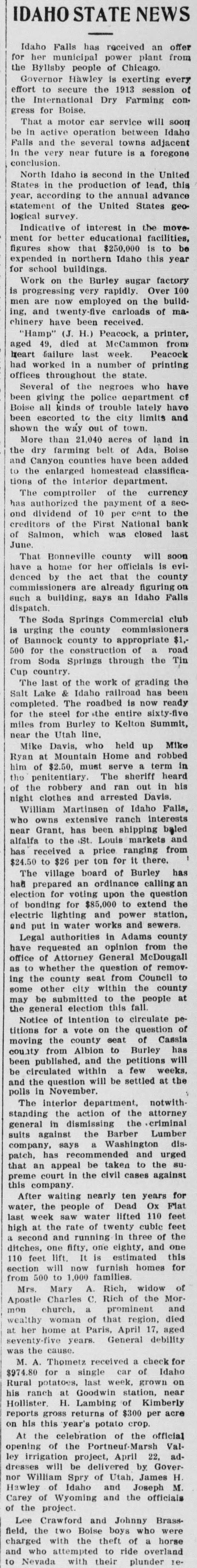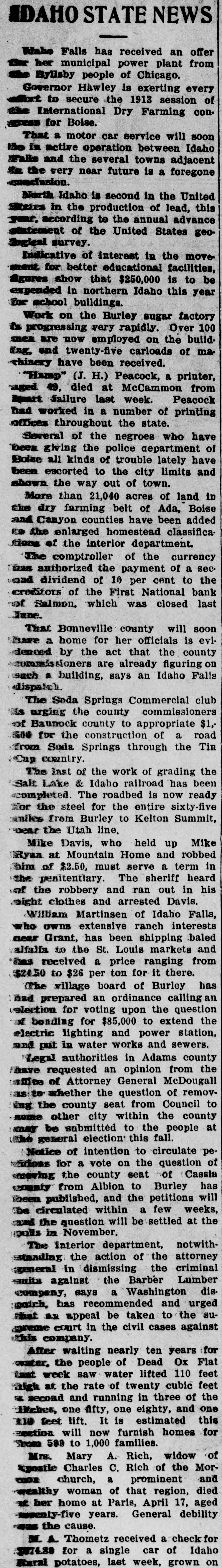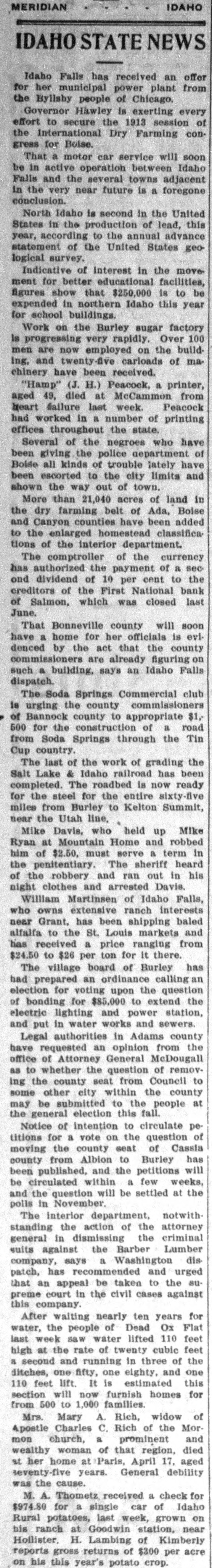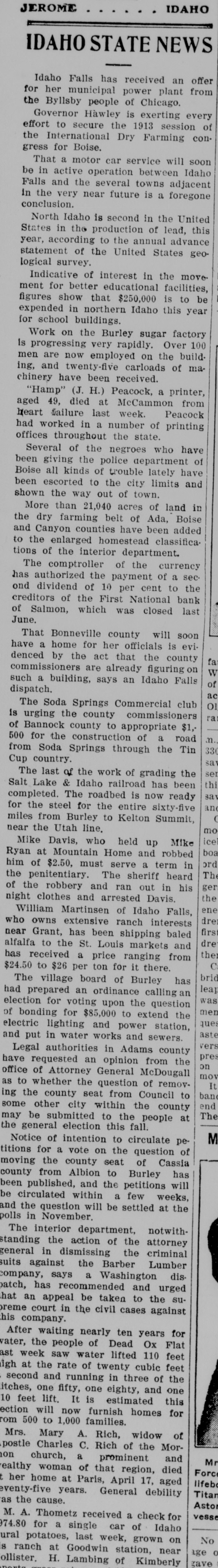 FIRST NATIONAL BANK SALMON CITY CLOSED Action Ordered by Special Bank Examiner-Large Loans the Cause of Failure The First National Bank of Salmon City, in Lemhi county, closed its doors today. A message was received in the city late this afternoon from Salmon bearing the above announcement. The bank was closed up by special nation al bank examiner from Washington D. C. Other than this information the telegram gave no details. The First National bank of Salmon was organized about five years ago and was regarded as one of the principal financial institutions of the Salmon City country. It was capitalized at $50,000 with a surpus of $7500. H. G. King, who is well known in Boise, was the president of the defunct institution and John Lottridge was cashier. Both of these men, as well as all others connected with the bank, have always been held in high regard by the patrons and friends of the institution, and have occupied enviable positions among the banking fraternity of the state. The only reason assigned by local parties for the failure of the bank at this time is the practice of mak ing heavy loans so great in volume that the institution's available funds were not sufficient to meet up with the demand. While the true state of affairs which brought about the closing are not known here, the belief prevails among men well informed upon the subject that this practice of overloaing is doubtless the direct cause of the failure. Charles S. Loveland, who is known to Boise citizens, is the regularly employed examiner for national banks but in this instance the bank was closed by a special federal agent. There are two other banks located at Salmon City, both of which are in excellent shape.