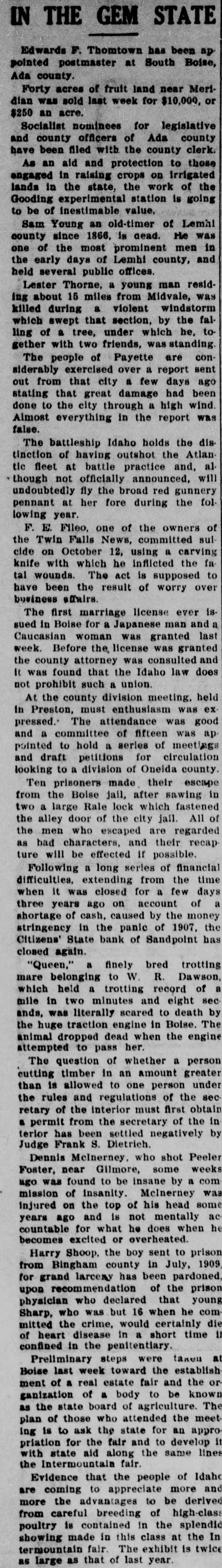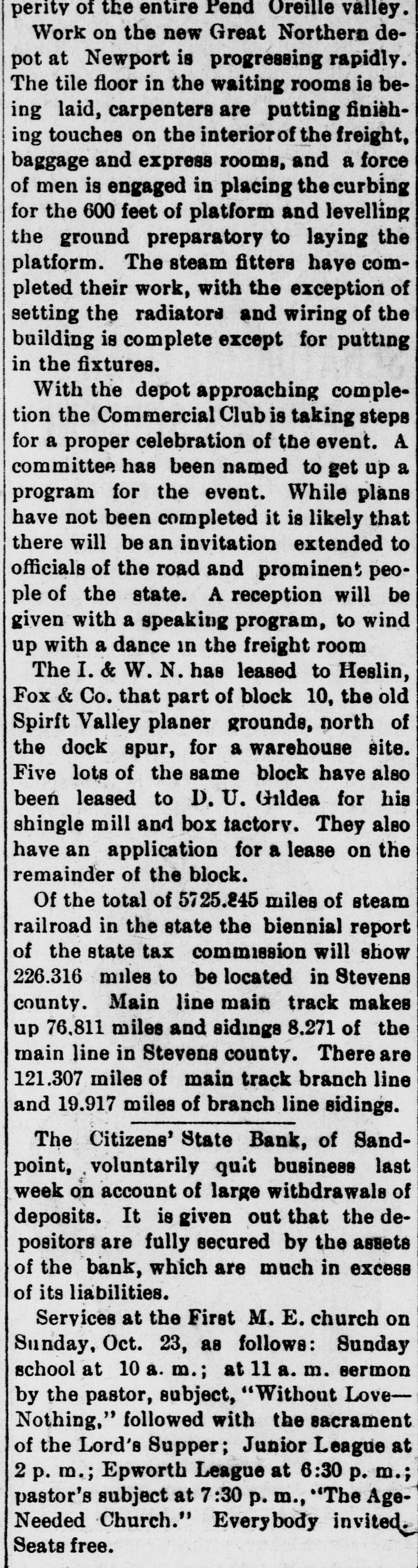 perity of the entire Pend Oreille valley. Work on the new Great Northern depot at Newport is progressing rapidly. The tile floor in the waiting rooms is being laid, carpenters are putting finishing touches on the interior of the freight, baggage and express rooms, and a force of men is engaged in placing the curbing for the 600 feet of platform and levelling the ground preparatory to laying the platform. The steam fitters have completed their work, with the exception of setting the radiators and wiring of the building is complete except for putting in the fixtures. With the depot approaching completion the Commercial Club is taking steps for a proper celebration of the event. A committee has been named to get up a program for the event. While plans have not been completed it is likely that there will be an invitation extended to officials of the road and prominent people of the state. A reception will be given with a speaking program, to wind up with a dance in the freight room The I. & W. N. has leased to Heslin, Fox & Co. that part of block 10, the old Spirft Valley planer grounds, north of the dock spur, for a warehouse site. Five lots of the same block have also been leased to D. U. Gildea for his shingle mill and box tactory. They also have an application for a lease on the remainder of the block. Of the total of 5725.845 miles of steam railroad in the state the biennial report of the state tax commission will show 226.316 miles to be located in Stevens county. Main line main track makes up 76,811 miles and sidings 8.271 of the main line in Stevens county. There are 121.307 miles of main track branch line and 19.917 miles of branch line sidings. The Citizens' State Bank, of Sandpoint, voluntarily quit business last week on account of large withdrawals of deposits. It is given out that the depositors are fully secured by the assets of the bank, which are much in excess of its liabilities. Services at the First M. E. church on Sunday, Oct. 23, as follows: Sunday school at 10 a. m.; at 11 a. m. sermon by the pastor, subject, "Without LoveNothing," followed with the eacrament of the Lord's Supper; Junior League at 2 p. m.; Epworth League at 6:30 p. m.; pastor's subject at 7:30 p. m., "The AgeNeeded Church." Everybody invited. Seats free.