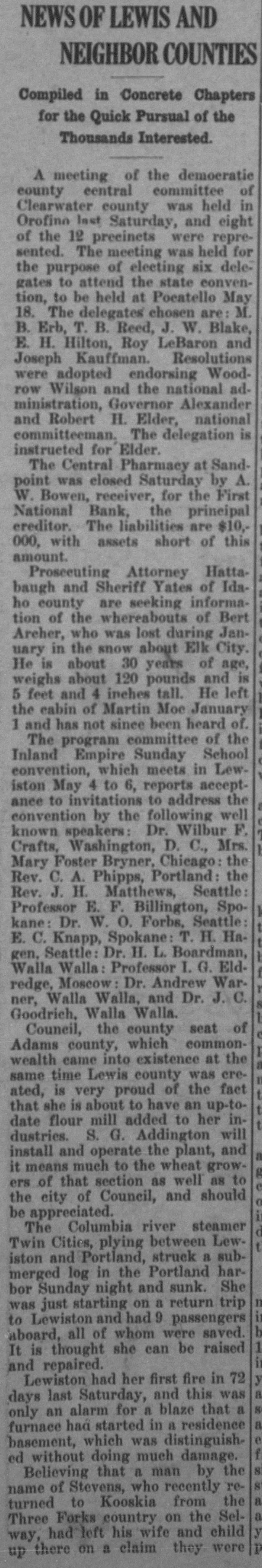 NEWS OF LEWIS AND NEIGHBOR COUNTIES Compiled in Concrete Chapters for the Quick Pursual of the Thousands Interested. A meeting of the demoeratie county central committee of Clearwater county was held in Orofino last Saturday, and eight of the 12 preeinets were represented. The meeting was held for the purpose of eleeting six delegates to attend the state convention, to be held at Poeatello May 18. The delegates chosen are: M. B. Erb, T. B. Reed, J. W. Blake, E. H. Hilton, Roy LeBaron and Joseph Kauffman. Resolutions were adopted endorsing Woodrow Wilson and the national administration, Governor Alexander and Robert H. Elder, national committeeman. The delegation is instrueted for Elder. The Central Pharmacy at Sandpoint was closed Saturday by A. W. Bowen, receiver, for the First National Bank, the principal creditor. The liabilities are $10,000, with assets short of this amount. Prosecuting Attorney Hattabaugh and Sheriff Yates of Idaho county are seeking information of the whereabouts of Bert Areher, who was lost during January in the snow about Elk City. He is about 30 years of age, weighs about 120 pounds and is 5 feet and 4 inches tall. He left the cabin of Martin Moc January 1 and has not since been heard of. The program committee of the Inland Empire Sunday School convention, which meets in Lewiston May 4 to 6, reports acceptance to invitations to address the convention by the following well known speakers: Dr. Wilbur F. Crafts, Washington, D. C., Mrs. Foster Bryner, Chicago: the A. Phipps, Mary Rev. C. Portland: Seattle: the Rev. J. H. Matthews, Professor E. F. Billington, SpoDr. W. O. Forbs, Seattle: Spokane: Dr. H. L. gen. E. kane: C. Seattle: Knapp, Boardman, T. H. HaWalla Walla: Professor L.G.E redge, Moscow : Dr. Andrew Warner, Walla Walla, and Dr. J. C. Goodrich. Walla Walla. Council, the county seat of Adams county, which common- the wealth came into existence at time Lewis county was cresame ated, is very proud of the fact that she is about to have an up-tomill added to S. G. Addington date dustries. flour plant, her will and ininstall and operate the it means much to the wheat grow- to of that section as well as ers the city of Council, and should be appreciated. The Columbia river steamer Twin Cities, plying between Lew- suband Portland, struck a harmerged iston log in the Portland She Sunday night and sunk. bor just starting on a return trip was Lewiston and had 9 passengers saved. aboard, to all of whom were raised It is thought she can be and Lewiston repaired. had her first fire in 72 last Saturday, and this that was a days an alarm for a blaze residence only had started in a basement, furnace which was distinguished without doing much damage. the Believing that a man by rea of Stevens, who recently the a name to Kooskia from the Selturned Forks country on child y Three had left his wife and were way, up there on a claim they