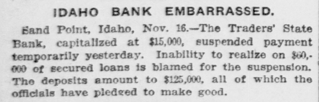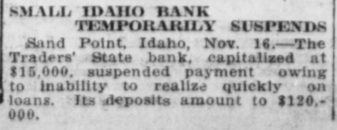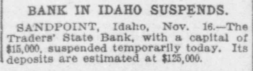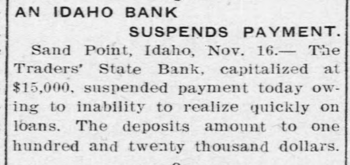 P AN IDAHO BANK SUSPENDS PAYMENT. Sand Point, Idaho, Nov. 16.- The Traders' State Bank, capitalized at $15,000. suspended payment today owing to inability to realize quickly on loans. The deposits amount to one hundred and twenty thousand dollars.