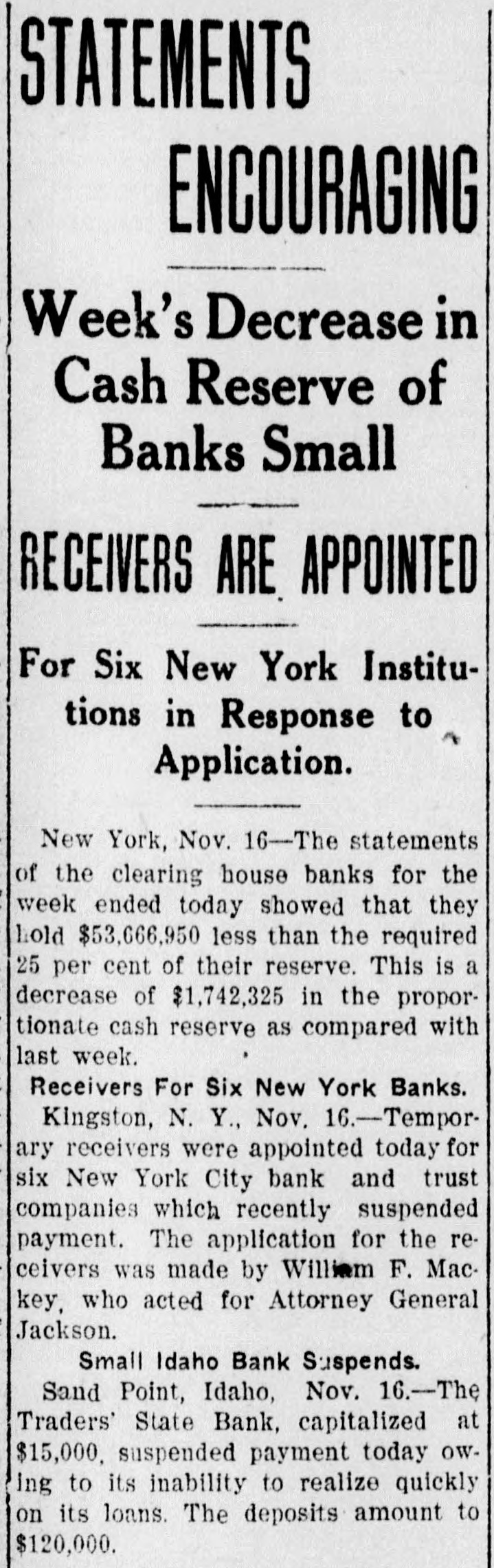 STATEMENTS ENCOURAGING Week's Decrease in Cash Reserve of Banks Small RECEIVERS ARE APPOINTED For Six New York Institutions in Response to Application. New York, Nov. 16-The statements of the clearing house banks for the week ended today showed that they hold $53,666,950 less than the required 25 per cent of their reserve. This is a decrease of $1,742,325 in the proportionate cash reserve as compared with last week. Receivers For Six New York Banks. Kingston, N. Y., Nov. 16.-Temporary receivers were appointed today for six New York City bank and trust companies which recently suspended payment. The application for the receivers was made by William F. Mackey, who acted for Attorney General Jackson. Small Idaho Bank Suspends. Sand Point, Idaho, Nov. 16.-The Traders' State Bank, capitalized at $15,000. suspended payment today OWing to its inability to realize quickly on its loans. The deposits amount to $120,000.