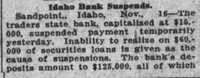 Idaho Bank Suspends. Sandpoint, Idaho, Nov., 16-The traders state bank, capitalized at $15,000, suspended payment temporarily yesterday. Inability to realize on $60. 000 of securities loans is given as the cause of suspensions. The bank's deposits amount to $125,000, all of which