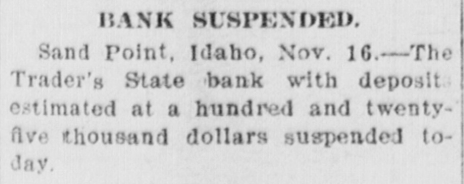 BANK SUSPENDED. Sand Point, Idaho, Nov. 16.-The Trader's State bank with deposit estimated at a hundred and twentyfive thousand dollars suspended today.