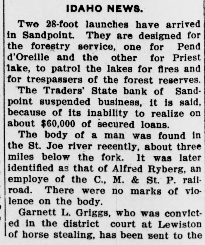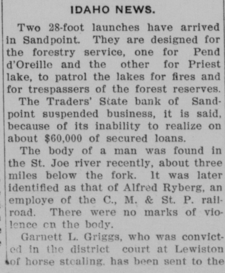 IDAHO NEWS. Two 28-foot launches have arrived in Sandpoint. They are designed for the forestry service, one for Pend d'Oreille and the other for Priest lake, to patrol the lakes for fires and for trespassers of the forest reserves. The Traders' State bank of Sandpoint suspended business, it is said, because of its inability to realize on about $60,000 of secured loans. The body of a man was found in the St. Joe river recently, about three miles below the fork. It was later identified as that of Alfred Ryberg, an employe of the C., M. & St. P. railroad. There were no marks of violence on the body. Garnett L. Griggs, who was convicted in the district court at Lewiston sof horse stealing. has been sent to the