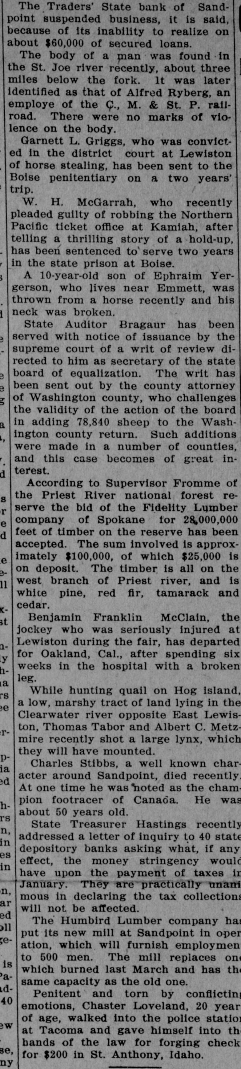 The Traders' State bank of Sandpoint suspended business, it is said, because of its inability to realize on about $60,000 of secured loans. The body of a man was found in the St. Joe river recently, about three miles below the fork. It was later identified as that of Alfred Ryberg, an employe of the C., M. & St. P. railroad. There were no marks of violence on the body. Garnett L. Griggs, who was convicted in the district court at Lewiston of horse stealing, has been sent to the Boise penitentiary on a two years' trip. W. H. McGarrah, who recently pleaded guilty of robbing the Northern Pacific ticket office at Kamiah, after telling a thrilling story of a hold-up, has been sentenced to serve two years in the state prison at Boise. A 10-year-old son of Ephraim Yergerson, who lives near Emmett, was thrown from a horse recently and his neck was broken. State Auditor Bragaur has been served with notice of issuance by the supreme court of a writ of review directed to him as secretary of the state e board of equalization. The writ has e been sent out by the county attorney of Washington county, who challenges the validity of the action of the board a in adding 78,840 sheep to the Washington county return. Such additions were made in a number of counties, and this case becomes of great interest. d According to Supervisor Fromme of S the Priest River national forest rer serve the bid of the Fidelity Lumber e company of Spokane for 28,000,000 d feet of timber on the reserve has been accepted. The sum involved is approxe imately $100,000, of which $25,000 is di on deposit. The timber is all on the 11 west branch of Priest river, and is white pine, red fir, tamarack and cedar. & st Benjamin Franklin McClain, the jockey who was seriously injured at Dr. Lewiston during the fair, has departed for Oakland, Cal., after spending six y weeks in the hospital with a broken Dleg. a While hunting quail on Hog island, rs a low, marshy tract of land lying in the e Clearwater river opposite East Lewiston, Thomas Tabor and Albert C. Metzrmire recently shot a large lynx, which they will have mounted. pCharles Stibbs, a well known charia acter around Sandpoint, died recently ed At one time he was "noted as the champion footracer of Canada. He was habout 50 years old. rs State Treasurer Hastings recently n, addressed a letter of inquiry to 40 state in depository banks asking what, if any es effect, the money stringency would in have upon the payment of taxes in January. They are practically unani n, mous in declaring the tax collections ar will not be affected. ed The Humbird Lumber company has oll put its new mill at Sandpoint in oper geation, which will furnish employmen to 500 men. The mill replaces on is which burned last March and has the asame capacity as the old one. dPenitent and torn by conflicting 40 emotions, Chaster Loveland, 20 year of age, walked into the police station W at Tacoma and gave himself into th hands of the law for forging check se, for $200 in St. Anthony, Idaho. ny