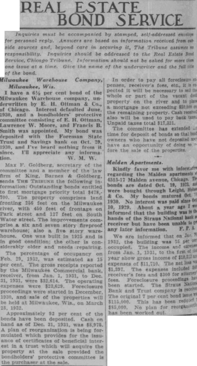 REAL ESTATE BOND SERVICE Inquiries must be by stamped, self-addressed envelope for personal reply. Answers are based on information from outside sources beyond care in securing it, The Tribune assumes responsibility. Inquiries should be addressed to the Real Estate Bond Service, should not be asked for than one issue time. Give the name of the underwriter and the bond. Milwaukee Warehouse Company, Milwaukee, Wis. have cent bond of the Milwaukee underwritten by H. Ottman Co., Chicago. Interest June, 1930, bondholders H. Ottman, Lawrence W. Moore, and Francis Smith was appointed. bond was deposited the Trust bank 1930, from since. I'll appreciate tion. Max Goldberg, secretary of the member firm Goldberg, sends the infirst total $478, land 256 feet the Milwaukee river, with 450 feet of on Park street and 127 feet on South prise six and seven story fireproof also five house. built in 1925 and good condition: the other siderably older and needs The of occupancy Feb. 29, 1932, was estimated as per cent. The gross receipts the Milwaukee bank, receiver, from Jan. 1931. to Dec. 31, $32,614. The operating expenses $23,629. Foreclosure in December, 1930, and of the will at Milwaukee, on March 92 per cent of the have hand of Dec. 31, 1931, was $8,975. A plan being for. mulated which for the issuance of of est trust which will acquire the property at the sale provided the bondholders' committee is In order to pay all foreclosure penses, fees, etc., pected will be whole or part the vacant dock property on the river and mortgage exceeding the property also be used taxes Unpaid taxes The has extended time for deposit of not doing fore the sale of the properties. Malden Kindly favor me with information the Malden apartments 4515-17 Malden Chicago. bonds are dated Oct. 10, were bought through Leight, Holser My bonds matured Oct. 1930. No interest was paid since 10. 1929. About year ago that the building hands the Straus National receiver but have unable any later information. We are informed that the building was and expenses from Jan. 1931, to the year show gross of $11,710. The $409 $1,397. The included expenses and for have fees. started. The Straus Bank and The This has been $85,000. No for