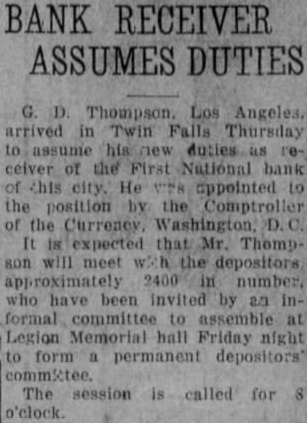 G. D Thompson... arrived in Twin Falls Thursday to assume his duties as receiver of the First National bank of this city. He was appointed by the Comptroller of the Currency, Washington, D.C..