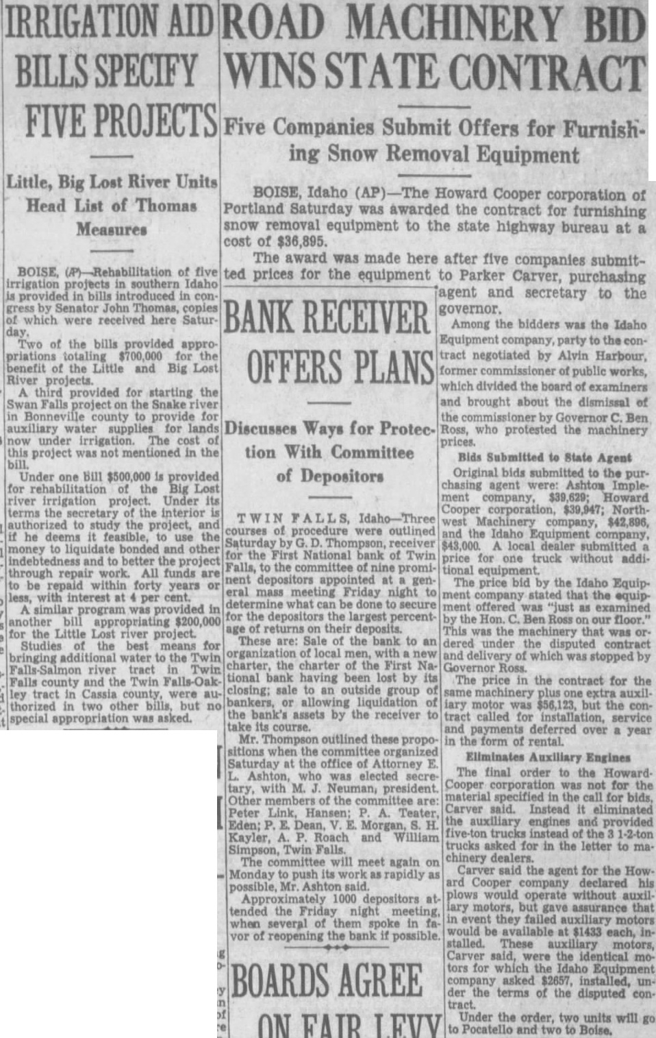 IRRIGATION AID ROAD MACHINERY BID SPECIFY WINS STATE CONTRACT FIVE PROJECTS Five Companies Submit Offers for Furnishing Snow Removal Equipment Little, Big Lost River Units Head List of Thomas Measures BOISE, Idaho Howard Cooper corporation of Portland Saturday was awarded the contract for furnishing snow removal equipment to the state highway bureau at cost of $36,895. The award was made here after five companies submitBOISE, (P)-Rehabilitation of five ted for the prices equipment to Parker Carver, purchasing irrigation southern agent and secretary to the in bills introduced in conby Senator John copies governor. BANK RECEIVER which were received here SaturAmong the bidders was the Idaho company, party to the conTwo of the bills provided appropriations totaling $700,000 the tract negotiated by Alvin Harbour, benefit of the Little and Big Lost OFFERS PLANS former public works, River projects. divided the board examiners A provided for starting the and brought about the dismissal of Falls project the Snake county to provide for the Governor auxiliary for Discusses Ways for Protec- Ross, who protested the machinery under The prices. this project was not in the tion With Committee Submitted to State Agent of Original bids submitted to the purUnder Bill $500,000 is provided Depositors chasing agent were: Ashton Implefor rehabilitation the Big ment company, $39,629; Howard irrigation Under its Cooper corporation, $39,947; Northterms the the interior west company, to study the project, courses of outlined and the Idaho Equipment company, he deems feasible, Saturday local dealer $43,000. money liquidate bonded and other for the First National bank of Twin price for one truck without addibetter the project the committee through repair work. All funds are nent at genbe repaid within forty years or The price bid by the Idaho Equiperal mass Friday night with interest at per cent. that the equipwhat can done offered was as similar program was for the depositors the largest bill $200,000 the Hon. our floor.' appropriating returns deposits. the was orfor the Little Lost project. These are: Sale the bank to dered under the disputed Studies best for water the and was stopped charter, the charter the First Nariver tract Twin tional bank having been by its county and the Twin The price the contract for the closing; sale outside group ley tract county, au- extra bankers, thorized in other but no iary motor the the bank's assets by the receiver special appropriation was asked. tract called installation, service course. and deferred over year in the form rental. Eliminates Auxiliary Engines The final order to the Howardwas not for material specified call for bids, Carver said. Instead it eliminated the auxiliary engines and provided trucks the trucks asked for in the letter to machinery Carver said the agent for the Howard Cooper declared would operate without lary motors, assurance that event they failed auxiliary motors would be available at $1433 each, stalled. These auxiliary motors, Carver said, were the identical tors for which Equipment asked $2657, installed, der the terms of the disputed Under the order, two units will go Pocatello two Boise.