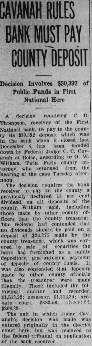 CAVANAH RULES BANK MUST DEPOSIT COUNTY Decision Involves $30,392 of Public Funds in First National Here A decision requiring D. Thompson, receiver of the First National bank. to pay to the counits $30,392 deposit which was the bank when it closed last December has been handed down by Federal Judge C. C. Cavanah at Boise, according to W. Witham, Twin Falls county attorney, who returned from the hearing of the case Tuesday afternoon. The decision requires the bank receiver to pay to the county previously declared 18 per cent dividend, on all deposits of the county, Witham said, including those made by other county offleers than the county treasurer The reciever had contended that no dividends should be paid on deposit of $26,375 made by the county treasurer. which was COVered by sale of securities the bank had furnished as public depository, guaranteeing payment of deposits of county funds. It was also contended that deposits made by other county officials than the treasurer were made illegally. These included the following: auditor and recorder, $1,513.22: assessor, $1,312.30; probate The suit in which Judge Cavanah's decision was made was entered originally in the district court here, but was removed to the federal tribunal on application of the bank receiver.