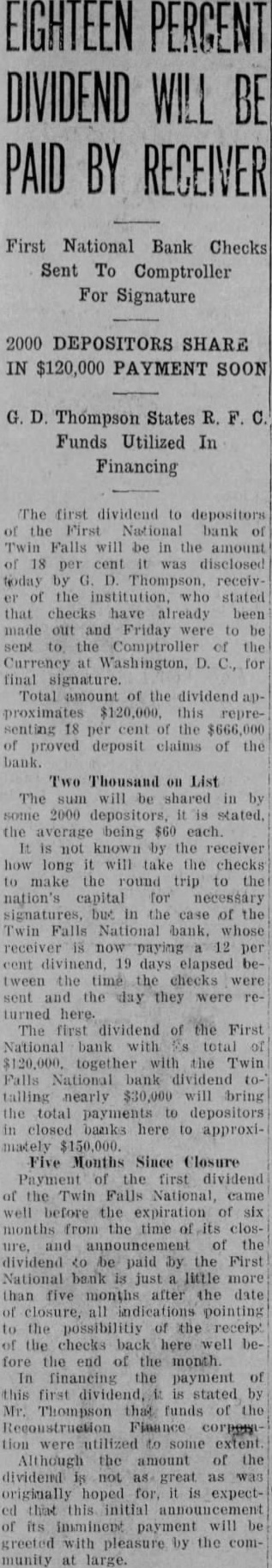 EIGHTEEN PERGENT DIVIDEND WILL BE PAID BY RECEIVER First National Bank Checks Sent To Comptroller For Signature 2000 DEPOSITORS SHARE IN $120,000 PAYMENT SOON G. D. Thompson States R. F.C. Funds Utilized In Financing The first dividend to depositors of the First National bank of Twin Falls will be in the amount of 18 per cent it was disclosed today by G. D. Thompson, receiver of the institution, who stated that checks have already been made out and Friday were to be sent to the Comptroller of the Currency at Washington, D. C., for final signature. Total amount of the dividend approximates $120,000, this representing 18 per cent of the $666,000 of proved deposit claims of the bank Two Thousand on List The sum will be shared in by some 2000 depositors, it is stated. the average being $60 each. It is not known by the receiver how long it will take the checks to make the round trip to the nation's capital for necessary signatures, but in the case of the Twin Falls National bank. whose receiver is now paying 12 per cent divinend. 19 days elapsed between the time the checks were sent and the day they were returned here. The first dividend of the First National bank with Es total of $120,000. together with the Twin Falls National bank dividend totalling nearly $30,000 will bring the total payments to depositors in closed banks here to approximately $150,000. Five Months Since Closure Payment of the first dividend of the Twin Falls National, came well before the expiration of six months from the time of its closure, and announcement of the dividend to be paid by the First National bank is just a little more than five months after the date of closure, all indications pointing to the possibilitiy of the receipt of the checks back here well before the end of the month In financing the payment of this first dividend, is stated by Mr. Thompson that funds of the Reconstruction Finance corport tion were utilized to some extent Although the amount of the dividend is not as great as was originally hoped for, it is expected that this initial announcement of its imminent payment will be greeted with pleasure by the community at large.