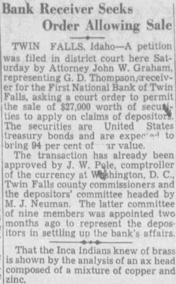 Bank Receiver Seeks Order Allowing Sale TWIN FALLS. Idaho-A petition was filed in district court here Saturday by Attorney John W. Graham. representing for the First National Bank of Twin Falls, asking court order to permit the sale of $27,000 worth of securito apply on claims of depositors The securities are United States treasury bonds and are expec bring 94 per value. The has already been by J. W. Pole, comptroller of the currency at Washington, D. Twin Falls and the depositors' committee headed by M. Neuman. The latter committee nine members was appointed two months ago represent the depos itors in settling up the bank's affairs. That the Inca Indians knew of brass shown by the of an ax head composed of mixture of copper and zinc.