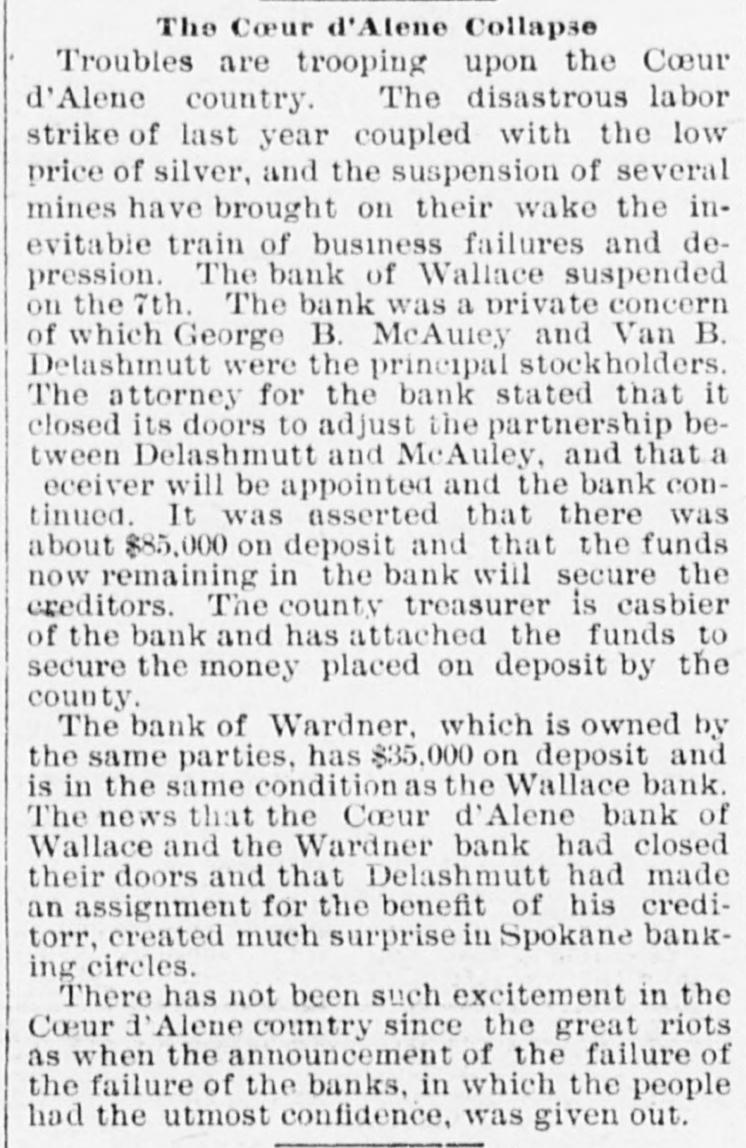 The Coeur d'Alene Collapse Troubles are trooping upon the Coeur d'Alene country. The disastrous labor strike of last year coupled with the low price of silver, and the suspension of several mines have brought on their wake the inevitable train of business failures and depression. The bank of Wallace suspended on the 7th. The bank was a private concern of which George B. McAuley and Van B. Delashmutt were the principal stockholders. The attorney for the bank stated that it closed its doors to adjust the partnership between Delashmutt and McAuley, and that a receiver will be appointed and the bank continued. It was asserted that there was about $85,000 on deposit and that the funds now remaining in the bank will secure the creditors. The county treasurer is casbier of the bank and has attached the funds to secure the money placed on deposit by the county. The bank of Wardner, which is owned by the same parties, has $35,000 on deposit and is in the same condition as the Wallace bank. The news that the Coeur d'Alene bank of Wallace and the Wardner bank had closed their doors and that Delashmutt had made an assignment for the benefit of his creditorr, created much surprise in Spokane banking circles. There has not been such excitement in the Coeur d'Alene country since the great riots as when the announcement of the failure of the failure of the banks, in which the people had the utmost confidence, was given out.
