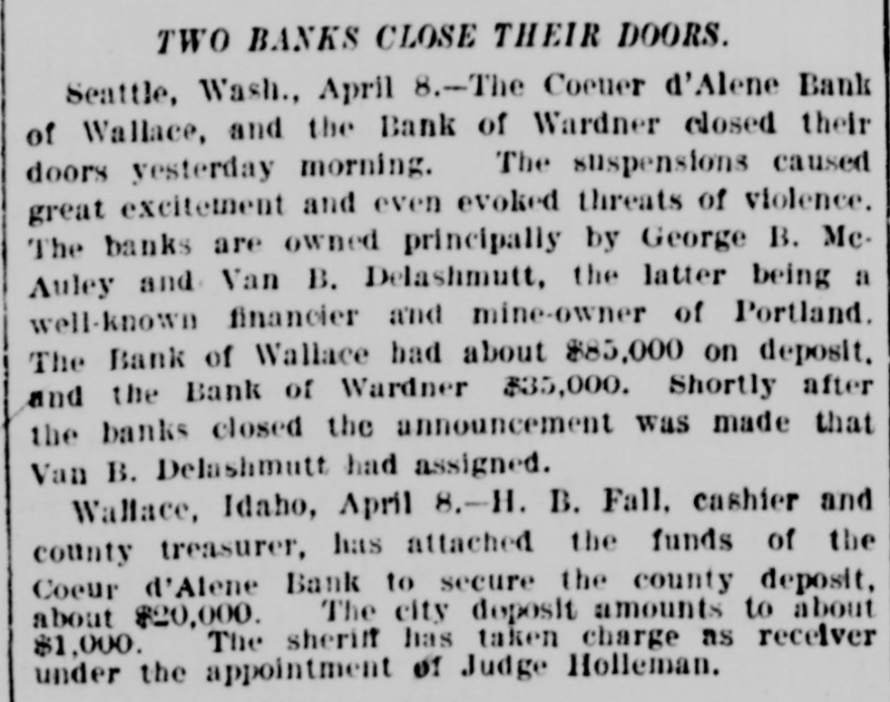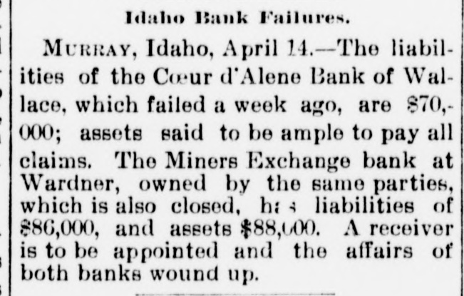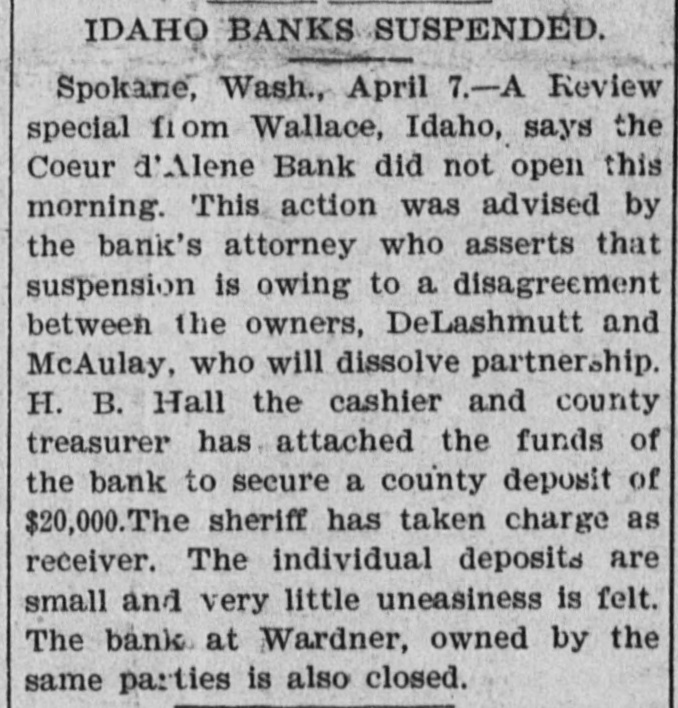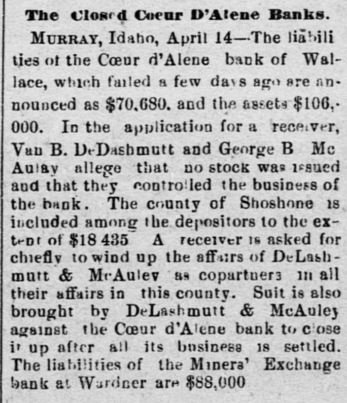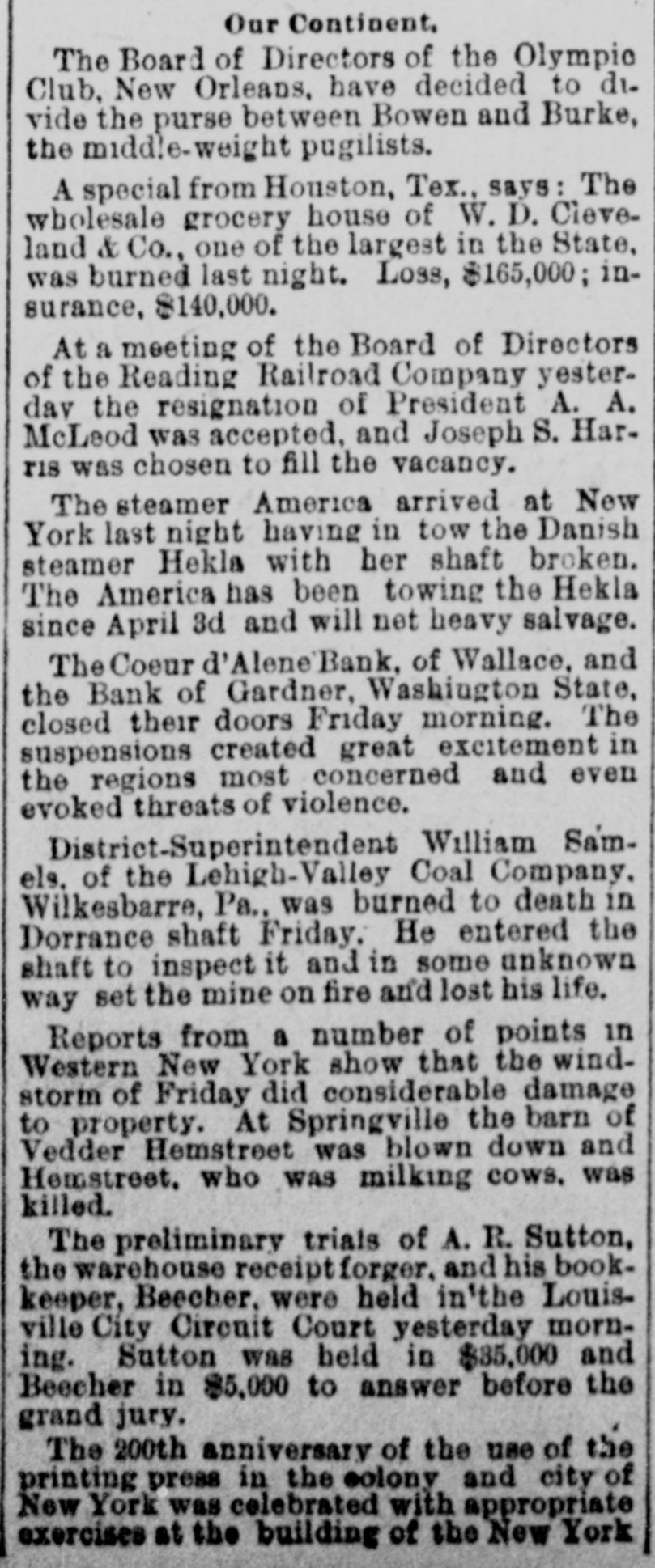 Our Continent. The Board of Directors of the Olympic Club, New Orleans, have decided to di. vide the purse between Bowen and Burke, the middle-weight pugilists. A special from Houston, Tex., says: The wholesale grocery house of W. D. Cleveland & Co., one of the largest in the State, was burned last night. Loss, $165,000; insurance, $140,000. At a meeting of the Board of Directors of the Reading Railroad Company yesterday the resignation of President A. A. McLeod was accepted, and Joseph S. Harris was chosen to fill the vacancy. The steamer America arrived at New York last night having in tow the Danish steamer Hekla with her shaft broken. The America has been towing the Hekla since April 3d and will net heavy salvage. The Coeur d'Alene'Bank. of Wallace, and the Bank of Gardner, Washington State, closed their doors Friday morning. The suspensions created great excitement in the regions most concerned and even evoked threats of violence. District-Superintendent William Samels. of the Lehigh-Valley Coal Company. Wilkesbarre, Pa.. was burned to death in Dorrance shaft Friday. He entered the shaft to inspect it and in some unknown way set the mine on fire and lost his life. Reports from a number of points in Western New York show that the windstorm of Friday did considerable damage to property. At Springville the barn of Vedder Hemstreet was blown down and Homstreet. who was milking cows. was killed. The preliminary trials of A. R. Sutton, the warehouse receiptforger. and his bookkeeper, Beecher. were held in'the Louisville City Circuit Court yesterday morning. Sutton was held in $35,000 and Beecher in 85,000 to answer before the grand jury. The 200th anniversary of the use of the printing press in the colony and city of New York was celebrated with appropriate exercises at the building of the New York