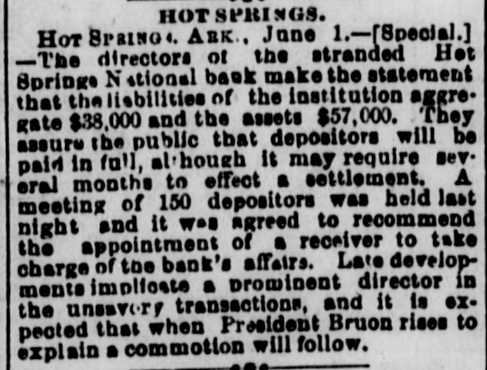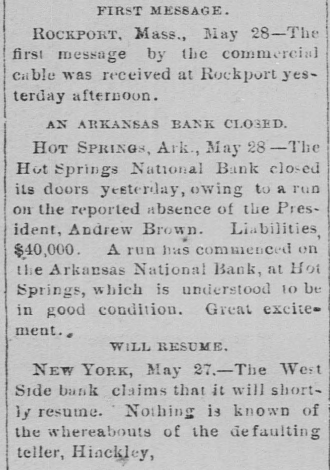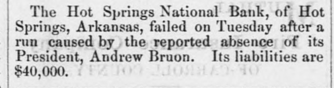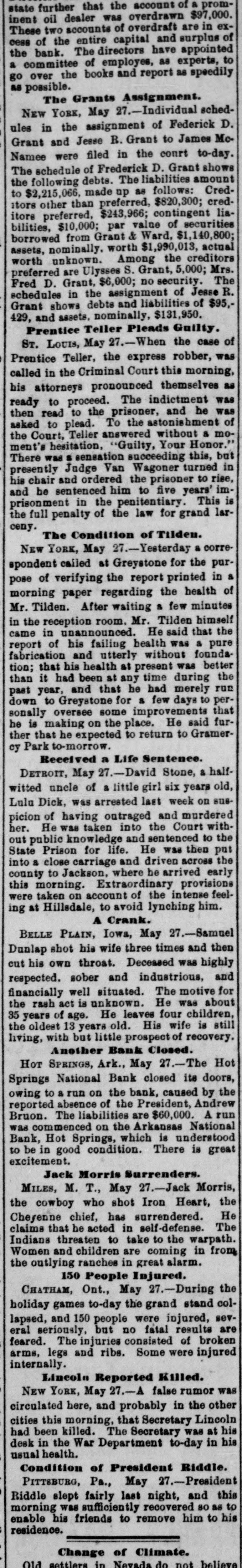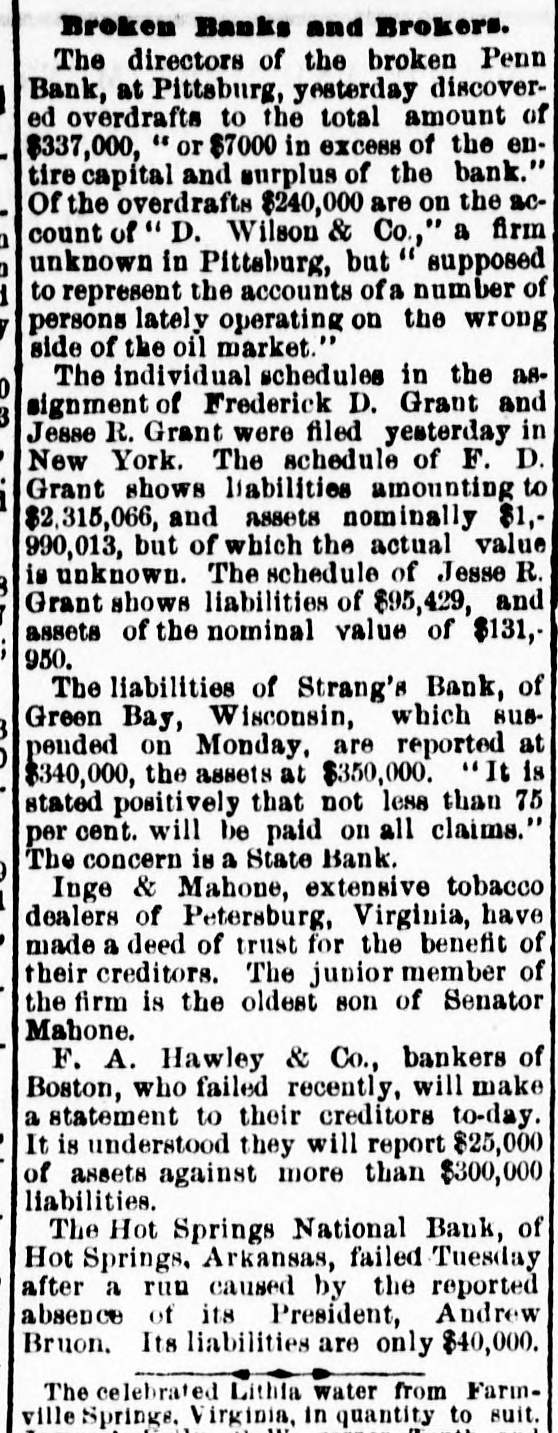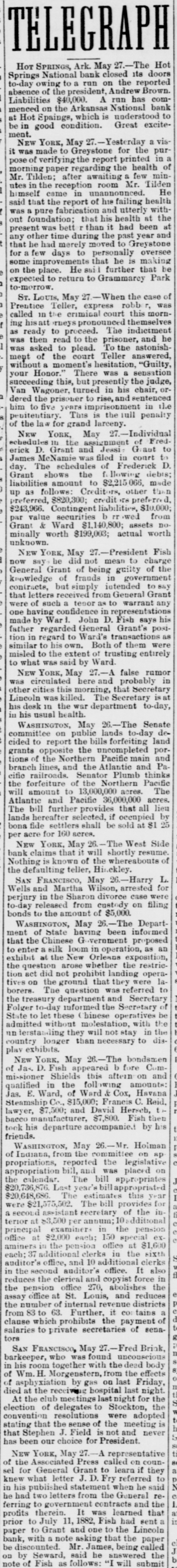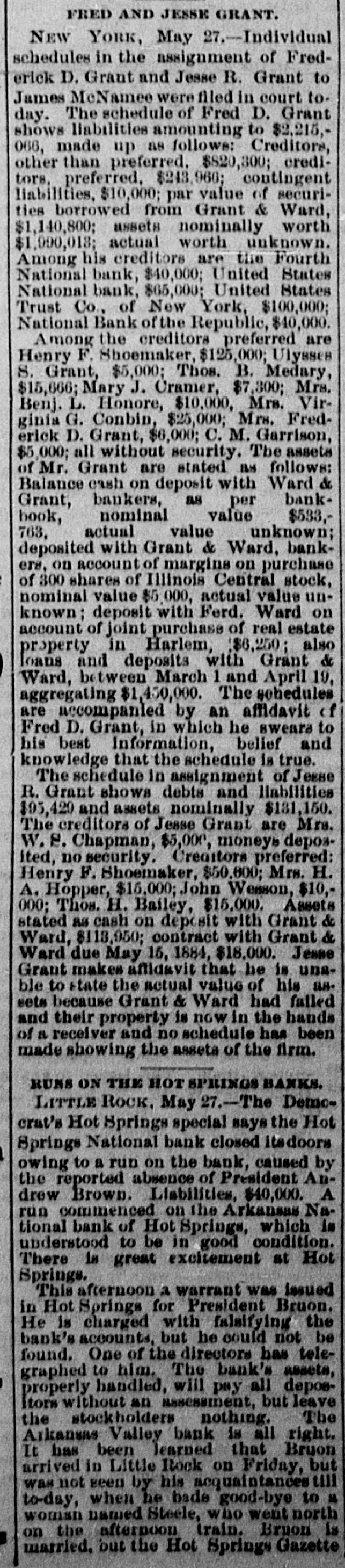 FRED AND JESSE GRANT. NEW YORK, May 27.-Individual schedules in the assignment of Frederick D. Grant and Jesse R. Grant to James McNamee were filed in court today. The schedule of Fred D. Grant shows liabilities amounting to $2,215,066, made up as follows: Creditors, other than preferred. $820,300; creditors, preferred, $243,960; contingent liabilities, $10,000; par value of securities borrowed from Grant & Ward, $1,140,800; assets nominally worth $1,990,018; actual worth unknown. Among his creditors are the Fourth National bank, $40,000; United States National bank, $65,000; United States Trust Co., of New York, $100,000; National Bank of the Republic, $40,000. Among the creditors preferred are Henry F. Shoemaker, $125,000; Ulysses S. Grant, $5,000; Thos. B. Medary, $15,666; Mary J. Cramer, $7,300; Mrs. Benj. L. Honore, $10,000, Mrs. Virginia G. Conbin, $25,000; Mrs. Frederick D. Grant, $6,000; C. M. Garrison, $5,000; all without security. The assets of Mr. Grant are stated as follows: Balance cash on deposit with Ward & Grant, bankers, as per bankbook, nominal value $533,763, actual value unknown; deposited with Grant & Ward, bankers, on account of margins on purchase of 300 shares of Illinois Central stock, nominal value $5,000, actual value unknown; deposit with Ferd. Ward on account of joint purchase of real estate property in Harlem, $6,250; also loans and deposits with Grant & Ward, between March 1 and April 19, aggregating $1,450,000. The schedules are accompanied by an affidavit of Fred D. Grant, in which he swears to his best Information, belief and knowledge that the schedule is true. The schedule in assignment of Jesse R. Grant shows debts and liabilities $95,429 and assets nominally $131,150. The creditors of Jesse Grant are Mrs. W. 8. Chapman, $5,000, moneys deposited, no security. Creditors preferred: Henry F. Shoemaker, $50,000; Mrs. H. A. Hopper, $15,000; John Wesson, $10,000; Thos. H. Bailey, $15,000. Assets stated BB cash on deposit with Grant & Ward, $113,950; contract with Grant & Ward due May 15, 1884, $18,000. Jesse Grant makes affidavit that he is unable to state the actual value of his assets because Grant & Ward had failed and their property is now in the hands of a receiver and no schedule has been made showing the assets of the firm. RUNS ON THE HOT SPRINGS BANKS. LITTLE ROCK, May 27.-The Democrat's Hot Springs special says the Hot Springs National bank closed itsdoors owing to a run on the bank, caused by the reported absence of President Andrew Brown. Liabilities, $40,000. A run commenced on the Arkansas National bank of Hot Springs, which in understood to be in good condition. There is great excitement at Hot Springs. This afternoon a warrant was issued in Hot Springs for President Bruon. He is charged with falsifying the bank's accounts, but he could not be found. One of the directors has telegraphed to him. The bank's assets, properly handled, will pay all deposItors without an assessment, but leave the stockholders nothing. The Arkansas Valley bank is all right. It has been learned that Bruon arrived in Little Rock on Friday, but was not seen by his acquaintances till to-day, when he bade good-bye to M woman named Steele, who went north on the afternoon train. Bruon is married, but the Hot Springs Gazette