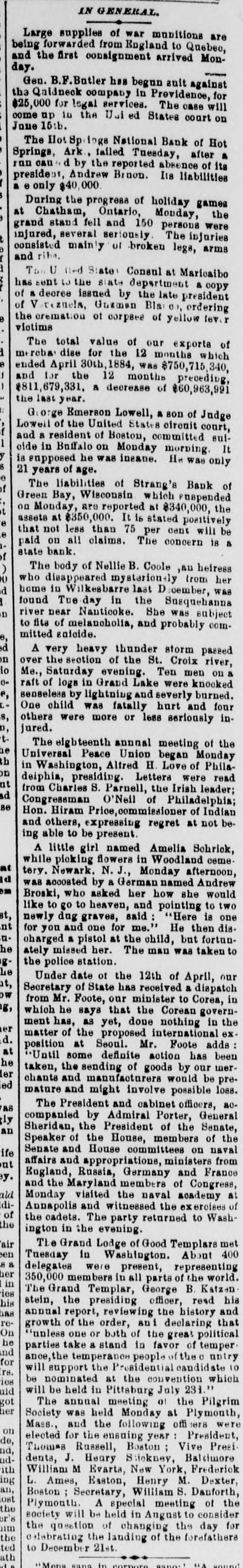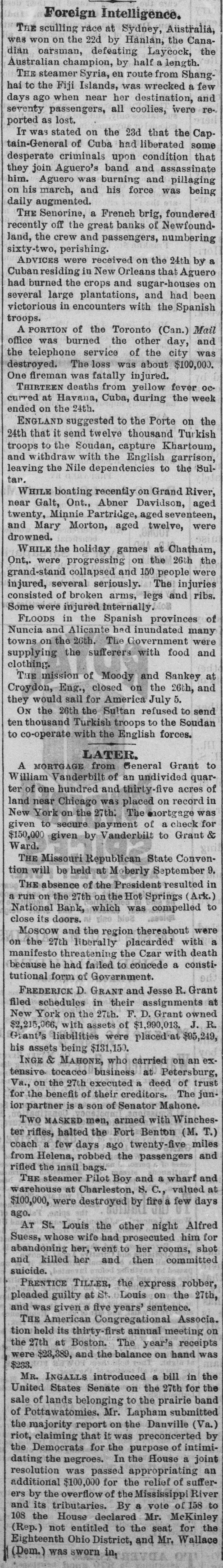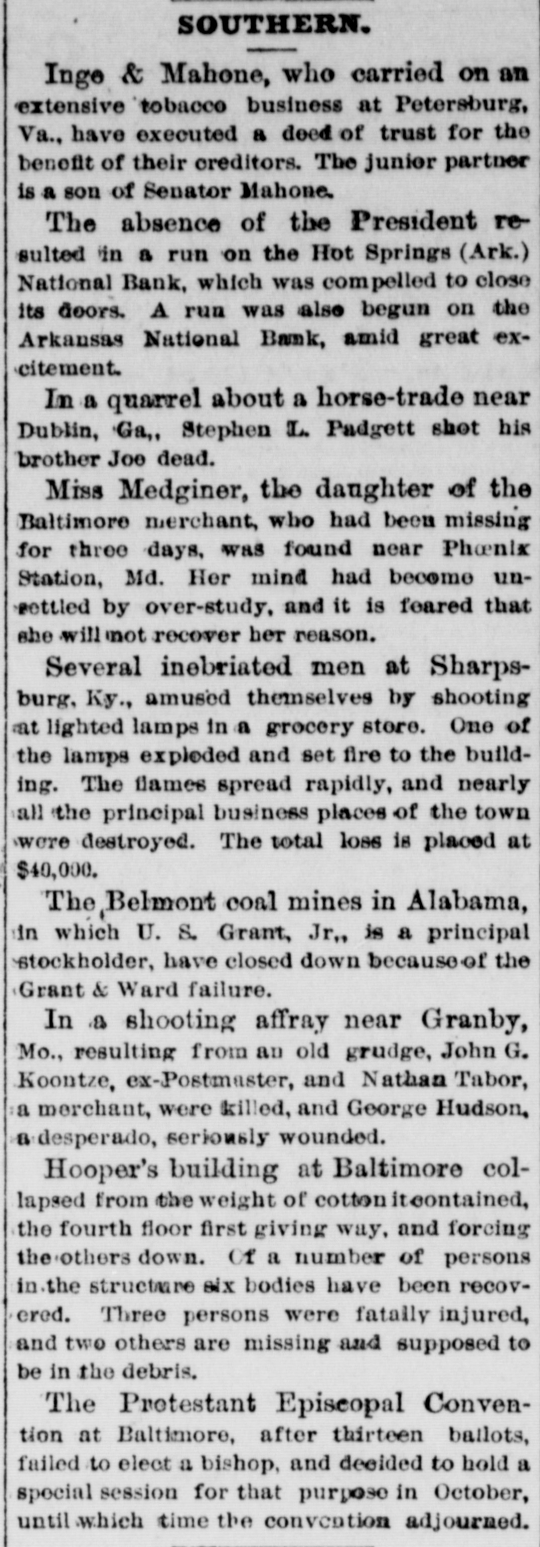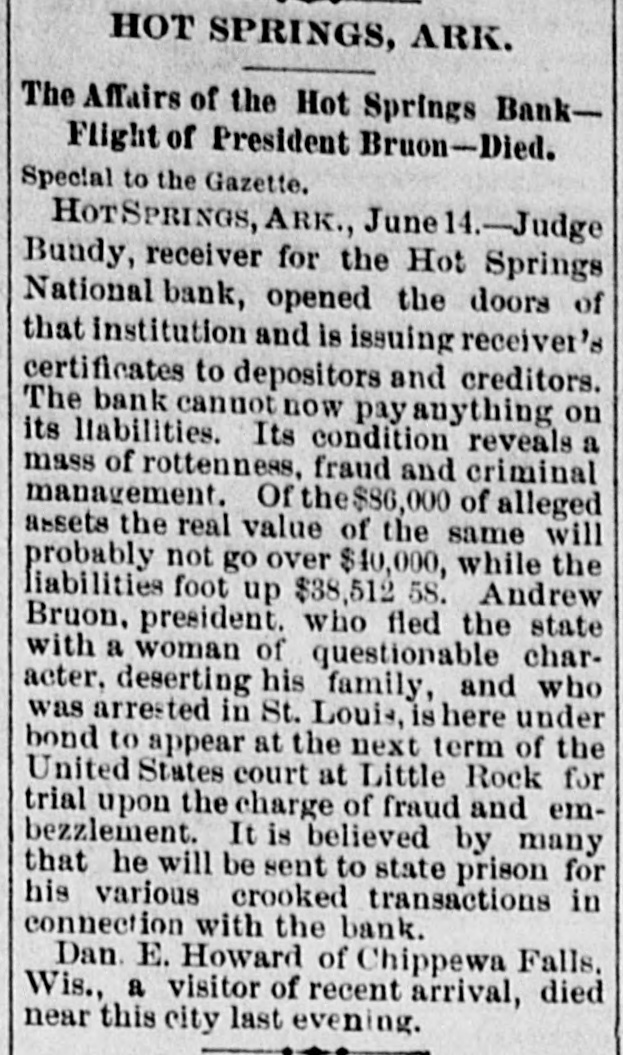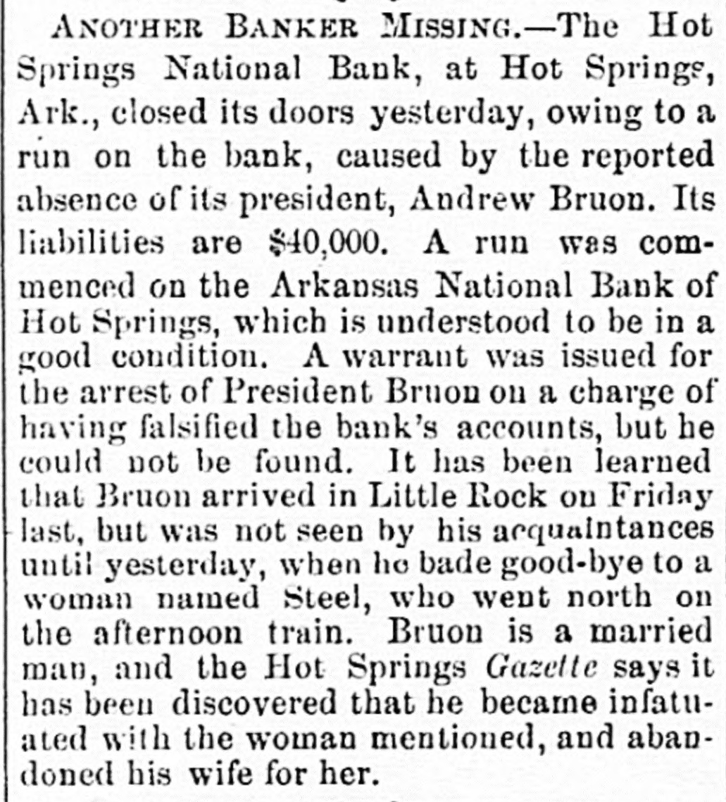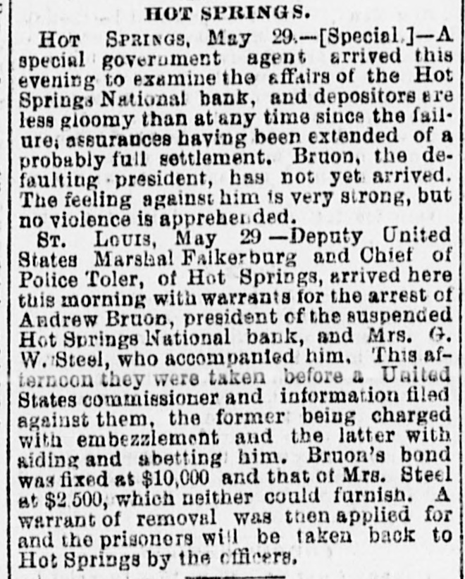 FRED AND JESSE GRANT. NEW YORK, May 27.-Individual schedules in the assignment of Frederick D. Grant and Jesse R. Grant to James McNamee were filed in court today. The schedule of Fred D. Grant shows liabilities amounting to $2,215,066, made up as follows: Creditors, other than preferred. $820,300; creditors, preferred, $243,960; contingent liabilities, $10,000; par value of securities borrowed from Grant & Ward, $1,140,800; assets nominally worth $1,990,018; actual worth unknown. Among his creditors are the Fourth National bank, $40,000; United States National bank, $65,000; United States Trust Co., of New York, $100,000; National Bank of the Republic, $40,000. Among the creditors preferred are Henry F. Shoemaker, $125,000; Ulysses S. Grant, $5,000; Thos. B. Medary, $15,666; Mary J. Cramer, $7,300; Mrs. Benj. L. Honore, $10,000, Mrs. Virginia G. Conbin, $25,000; Mrs. Frederick D. Grant, $6,000; C. M. Garrison, $5,000; all without security. The assets of Mr. Grant are stated as follows: Balance cash on deposit with Ward & Grant, bankers, as per bankbook, nominal value $533,763, actual value unknown; deposited with Grant & Ward, bankers, on account of margins on purchase of 300 shares of Illinois Central stock, nominal value $5,000, actual value unknown; deposit with Ferd. Ward on account of joint purchase of real estate property in Harlem, $6,250; also loans and deposits with Grant & Ward, between March 1 and April 19, aggregating $1,450,000. The schedules are accompanied by an affidavit of Fred D. Grant, in which he swears to his best Information, belief and knowledge that the schedule is true. The schedule in assignment of Jesse R. Grant shows debts and liabilities $95,429 and assets nominally $131,150. The creditors of Jesse Grant are Mrs. W. 8. Chapman, $5,000, moneys deposited, no security. Creditors preferred: Henry F. Shoemaker, $50,000; Mrs. H. A. Hopper, $15,000; John Wesson, $10,000; Thos. H. Bailey, $15,000. Assets stated BB cash on deposit with Grant & Ward, $113,950; contract with Grant & Ward due May 15, 1884, $18,000. Jesse Grant makes affidavit that he is unable to state the actual value of his assets because Grant & Ward had failed and their property is now in the hands of a receiver and no schedule has been made showing the assets of the firm. RUNS ON THE HOT SPRINGS BANKS. LITTLE ROCK, May 27.-The Democrat's Hot Springs special says the Hot Springs National bank closed itsdoors owing to a run on the bank, caused by the reported absence of President Andrew Brown. Liabilities, $40,000. A run commenced on the Arkansas National bank of Hot Springs, which in understood to be in good condition. There is great excitement at Hot Springs. This afternoon a warrant was issued in Hot Springs for President Bruon. He is charged with falsifying the bank's accounts, but he could not be found. One of the directors has telegraphed to him. The bank's assets, properly handled, will pay all deposItors without an assessment, but leave the stockholders nothing. The Arkansas Valley bank is all right. It has been learned that Bruon arrived in Little Rock on Friday, but was not seen by his acquaintances till to-day, when he bade good-bye to M woman named Steele, who went north on the afternoon train. Bruon is married, but the Hot Springs Gazette