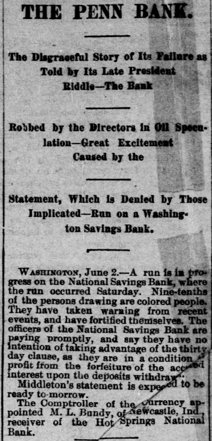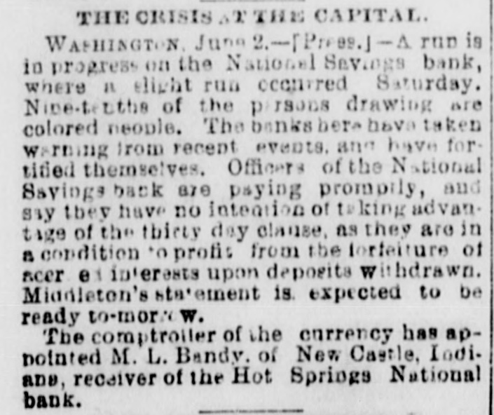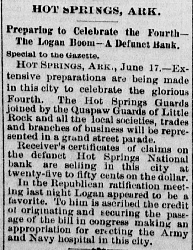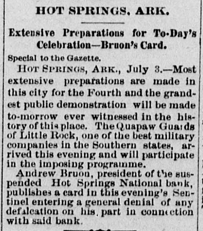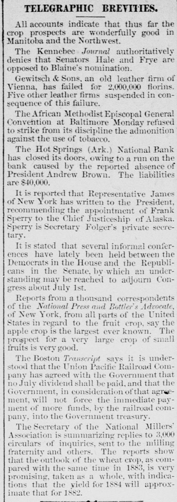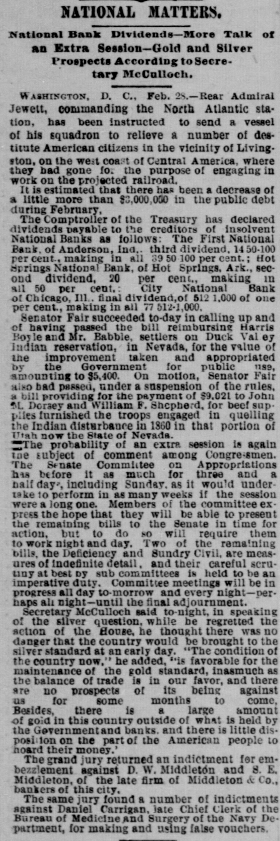 FRED AND JESSE GRANT. NEW YORK, May 27.-Individual schedules in the assignment of Frederick D. Grant and Jesse R. Grant to James McNamee were filed in court today. The schedule of Fred D. Grant shows liabilities amounting to $2,215,066, made up as follows: Creditors, other than preferred. $820,300; creditors, preferred, $243,960; contingent liabilities, $10,000; par value of securities borrowed from Grant & Ward, $1,140,800; assets nominally worth $1,990,018; actual worth unknown. Among his creditors are the Fourth National bank, $40,000; United States National bank, $65,000; United States Trust Co., of New York, $100,000; National Bank of the Republic, $40,000. Among the creditors preferred are Henry F. Shoemaker, $125,000; Ulysses S. Grant, $5,000; Thos. B. Medary, $15,666; Mary J. Cramer, $7,300; Mrs. Benj. L. Honore, $10,000, Mrs. Virginia G. Conbin, $25,000; Mrs. Frederick D. Grant, $6,000; C. M. Garrison, $5,000; all without security. The assets of Mr. Grant are stated as follows: Balance cash on deposit with Ward & Grant, bankers, as per bankbook, nominal value $533,763, actual value unknown; deposited with Grant & Ward, bankers, on account of margins on purchase of 300 shares of Illinois Central stock, nominal value $5,000, actual value unknown; deposit with Ferd. Ward on account of joint purchase of real estate property in Harlem, $6,250; also loans and deposits with Grant & Ward, between March 1 and April 19, aggregating $1,450,000. The schedules are accompanied by an affidavit of Fred D. Grant, in which he swears to his best Information, belief and knowledge that the schedule is true. The schedule in assignment of Jesse R. Grant shows debts and liabilities $95,429 and assets nominally $131,150. The creditors of Jesse Grant are Mrs. W. 8. Chapman, $5,000, moneys deposited, no security. Creditors preferred: Henry F. Shoemaker, $50,000; Mrs. H. A. Hopper, $15,000; John Wesson, $10,000; Thos. H. Bailey, $15,000. Assets stated BB cash on deposit with Grant & Ward, $113,950; contract with Grant & Ward due May 15, 1884, $18,000. Jesse Grant makes affidavit that he is unable to state the actual value of his assets because Grant & Ward had failed and their property is now in the hands of a receiver and no schedule has been made showing the assets of the firm. RUNS ON THE HOT SPRINGS BANKS. LITTLE ROCK, May 27.-The Democrat's Hot Springs special says the Hot Springs National bank closed itsdoors owing to a run on the bank, caused by the reported absence of President Andrew Brown. Liabilities, $40,000. A run commenced on the Arkansas National bank of Hot Springs, which in understood to be in good condition. There is great excitement at Hot Springs. This afternoon a warrant was issued in Hot Springs for President Bruon. He is charged with falsifying the bank's accounts, but he could not be found. One of the directors has telegraphed to him. The bank's assets, properly handled, will pay all deposItors without an assessment, but leave the stockholders nothing. The Arkansas Valley bank is all right. It has been learned that Bruon arrived in Little Rock on Friday, but was not seen by his acquaintances till to-day, when he bade good-bye to M woman named Steele, who went north on the afternoon train. Bruon is married, but the Hot Springs Gazette