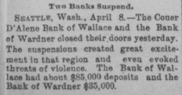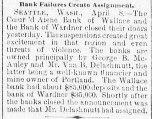 TWO BANKS CLOSE THEIR DOORS. Seattle, Wash., April 8.-The Coeuer d'Alene Bank of Wallace, and the Bank of Wardner closed their doors yesterday morning. The suspensions caused great excitement and even evoked threats of violence. The banks are owned principally by George B. Mc. Auley and Van B. Delashmutt, the latter being a well-known financier and mine-owner of Portland. The Bank of Wallace had about $85,000 on deposit. and the Bank of Wardner $35,000. Shortly after the banks closed the announcement was made that Van B. Delashmutt had assigned. Wallace, Idaho, April 8.-H. B. Fall, cashier and county treasurer, has attached the funds of the Coeur d'Alene Bank to secure the county deposit, about $20,000. The city deposit amounts to about $1,000. The sheriff has taken charge as receiver under the appointment of Judge Holleman.