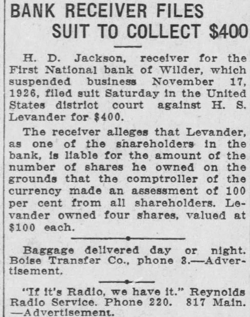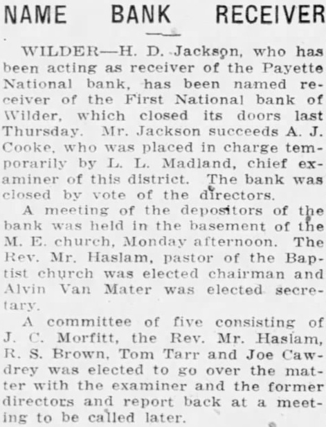 NAME BANK RECEIVER D. Jackson, who has been acting as receiver of the Payette National bank, has been named receiver First National bank of Wilder, which closed its doors last Thursday Mr. Jackson succeeds placed in charge temporarily Madland, chief examiner of this district. The bank was closed by vote of the directors of depositors of in the basement of The Mr. of the and Alvin Van Mater was elected secrecommittee of five consisting of Morfitt, the Rev. Mr Haslam, Tarr and Joe drey elected go the matthe examiner and the former directors and report back at meeting to be called later