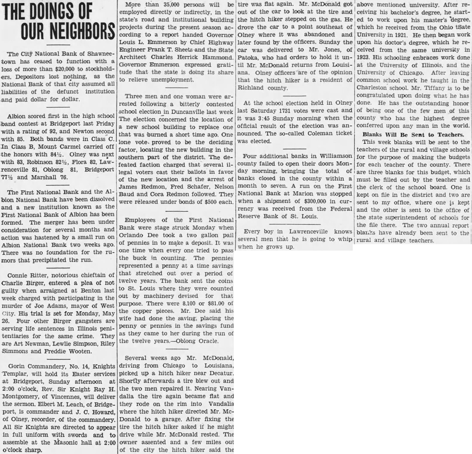 THE DOINGS OF OUR NEIGHBORS The City National Bank of Shawneetown has ceased to function with a loss of more than $20,000 to stockholders. Depositors lost nothing, as the National Bank of that city assumed all liabilities of the defunct institution and paid dollar for dollar. Albion scored first in the high school band contest at Bridgeport last Friday with a rating of 92, and Newton second with 85. Both bands were in Class C. In Class B, Mount Carmel carried off the honors with 84½. Olney was next with 83, Robinson 82½, Flora 82, Lawrenceville 81, Oblong 81, Bridgeport 77½ and Marshall 76. The First National Bank and the Albion National Bank have been dissolved and a new institution known as the First National Bank of Albion has been formed. The merger has been under consideration for several months and action was hastened by a small run on Albion National Bank two weeks ago. There was no foundation for the rumors that precipitated the run. Connie Ritter, notorious chieftain of Charlie Birger, entered a plea of not guilty when arraigned at Benton last week charged with participating in the murder of Joe Adams, mayor of West City. His trial is set for Monday, May 26. Four other Birger gangsters are serving life sentences in Illinois penitentiaries for the same crime. They are Art Newman, Lewlie Simpson, Riley Simmons and Freddie Wooten. Gorin Commandery, No. 14, Knights Templar, will hold its Easter services at Bridgeport, Sunday afternoon at 2:00 o'clock, Rev. Sir Knight Ray H. Montgomery, of Vincennes, will deliver the sermon. Elbert M. Leach, of Bridgeport, is commander and J. C. Howard, of Olney, recorder, of the commandery. All Sir Knights are directed to appear in full uniform with swords and to assemble at the Masonic hall at 2:00 o'clock sharp. More than 35,000 persons will be employed directly or indirectly, in the state's road and institutional building projects during the present season according to a report handed Governor Louis L. Emmerson by Chief Highway Engineer Frank T. Sheets and the State Architect Charles Herrick Hammond. Governor Emmerson expressed gratitude that the state is doing its share to relieve unemployment. Three men and one woman were arrested following a bitterly contested school election in Duncanville last week The election concerned the location of a new school building to replace one that was burned a short time ago. One lone vote. proved to be the deciding factor, locating the new building in the southern part of the district. The defeated faction charged that several illegal voters cast their ballots in favor of the new location and the arrest of James Redmon, Fred Schafer, Nelson Baud and Cora Redmon followed. They were released under bonds of $500 each. Employees of the First National Bank were stage struck Monday when Orlando Dee took a two gallon pail of pennies in to make a deposit. It was one time when every one tried to pass the buck in counting. The pennies represented a penny at a time savings that stretched out over a period of twelve years. The bank sent the coins to St. Louis where they were counted out by machinery devised for that purpose. There were 8,100 or $81.00 of the copper pieces. Mr. Dee said his wife had done the saving, placing the penny or pennies in the savings fund as they came to her during the run of the twelve years.-Oblong Oracle. Several weeks ago Mr. McDonald, driving from Chicago to Louisiana, picked up a hitch hiker near Decatur. Shortly afterwards a tire blew out and the two men repaired it. Nearing Vandalia the tire again became flat and they rode on the rim into Vandalia where the hitch hiker directed Mr. McDonald to a garage. After fixing the tire the hitch hiker asked if he might drive while Mr. McDonald rested. The owner assented and a few miles out of the city the hitch hiker said the tire was flat again. Mr. McDonald got out of the car to look at the tire and the hitch hiker stepped on the gas. He drove the car to a point southeast of Olney where it was abandoned and later found by the officers. Sunday the car was delivered to Mr. Jones, of Patoka, who had orders to hold it until Mr. McDonald returns from Louisiana. Olney officers are of the opinion that the hitch hiker is a resident of Richland county. At the school election held in Olney last Saturday 1731 votes were cast and it was 3:45 Sunday morning when the official result of the election was announced. The so-called Coleman ticket was elected. Four additional banks in Williamson county failed to open their doors Monday morning, bringing the total of banks closed in the county within a month to seven. A run on the First National Bank at Marion was stopped when a shipment of $300,000 in currency was received from the Federal Reserve Bank of St. Louis. Every boy in Lawrenceville knows several men that he is going to whip when he grows up. above mentioned university. After receiving his bachelor's degree, he started to work upon his master's degree, which he received from the Ohio tSate University in 1921. He then began work upon his doctor's degree, which he received from the same university in 1923. His schooling enbraces work done at the University of Illinois, and the University of Chicago. After leaving common school work he taught in the Charleston school. Mr. Tiffany is to be congratulated upon doing what he has done. He has the outstanding honor of being one of the few men of this county who has the highest degree conferred upon any man in the world. Blanks Will Be Sent to Teachers. This week blanks will be sent to the teachers of the rural and village schools for the purpose of making the budgets for each teacher of the county. There are three blanks for this budget, which must be filled out by the teacher and the clerk of the school board. One is kept on file in the district and two are sent to my office, where one is kept and the other is sent to the office of the state superintendent of schools for the file there. The two annual report blan