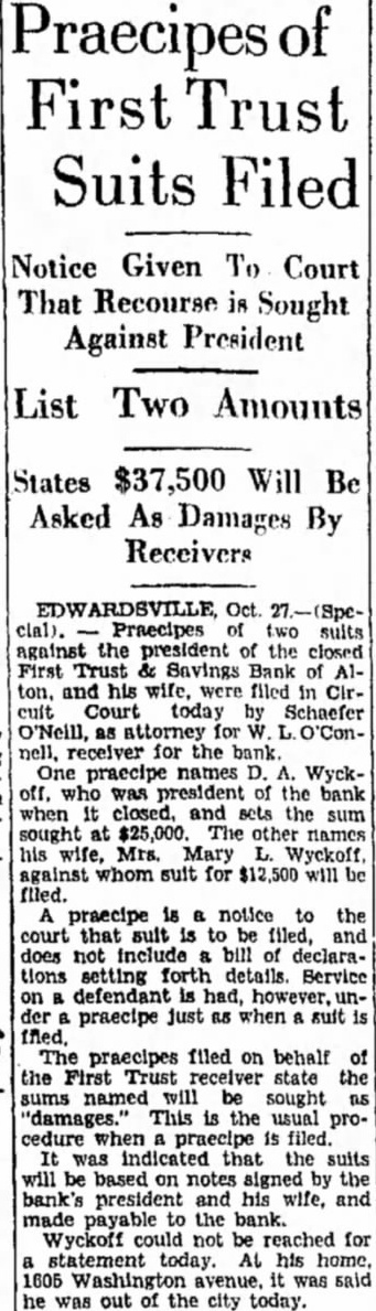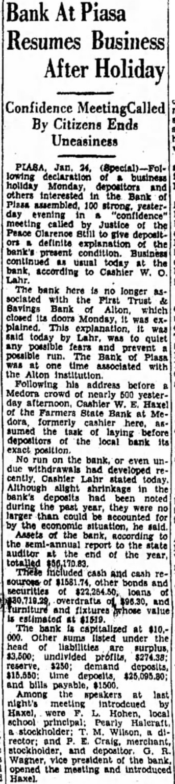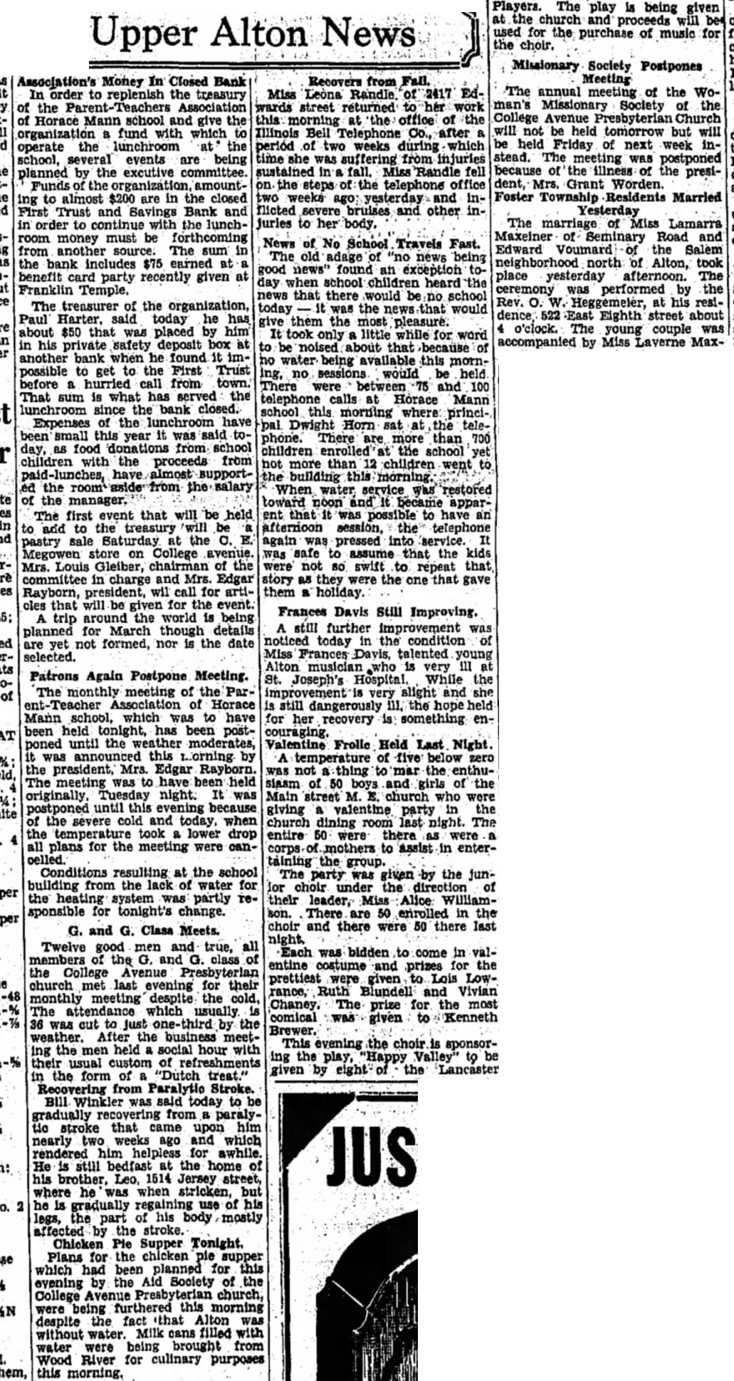 G. and G. Class Meets. Twelve good men and true, all members of the G. and G. class of the College Avenue Presbyterlan church met last evening for their monthly meeting despite the cold, The attendance which usually is 36 was cut to just one-third by the Brewer. weather. After the business meeting the men held a social hour with their usual custom of refreshments in the form of "Dutch treat." Recovering from Paralytic Stroke. Bill Winkler was said today to be gradually recovering from a paralytic stroke that came upon him nearly two weeks ago and which rendered him helpless for awhile He is still bedfast at the home of his brother, Leo, 1514 Jersey street, where he was when stricken, but he is gradually regaining use of his legs, the part of his body mostly affected by the stroke. Chicken Pie Supper Tonight. Plans for the chicken pie supper which had been planned for this evening by the Aid Society of the College Avenue Presbyterian church, were being furthered this morning despite the fact that Alton was without water. Milk cans filled with water were being brought from Wood River for culinary purposes this morning.