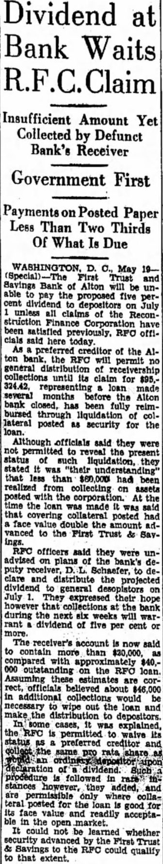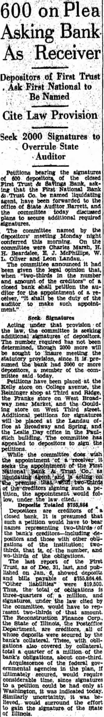 Association's Money In Closed Bank In order to replenish the treasury of the Parent-Teachers Association of Horace Mann school and give the organization a fund with which to operate the lunchroom at the school, several events are being planned by the excutive committee. Funds of the organization amounting to almost $200 are in the closed First Trust and Savings Bank and in order to continue with the lunchroom money must be forthcoming from another source. The sum in the bank includes $75 earned at a benefit card party recently given at Franklin The treasurer of the organization, Paul Harter. said today he has about $50 that was placed by him in his private safety deposit box at another bank when he found it impossible to get to the First Trust before a hurried call from town. That sum is what has served the lunchroom since the bank closed. Expenses of the lunchroom have been small this year it was said to. day, as food donations from school children with the proceeds from paid-lunches, have almost supported the room aside from the salary of the manager. The first event that will be held to add to the treasury will be pastry sale Saturday at the C. E. Megowen store on College avenue. Mrs. Louis Gleiber, chairman of the committee in charge and Mrs. Edgar Rayborn, president, will call for articles that will be given for the event. A trip around the world is being planned for March though details are yet not formed, nor is the date selected.