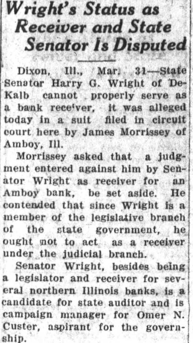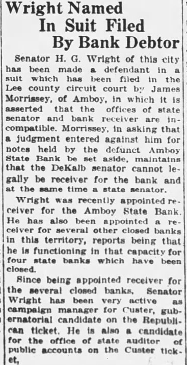 Wright Named In Suit Filed By Bank Debtor Senator Wright of this city has been made defendant in filed the county circuit court James Morrissey, of Amboy, in which asserted that the offices state senator bank are compatible. asking that judgment entered against him for notes held by the defunct Amboy State aside, maintains that the DeKalb senator cannot gally receiver for the bank and same time senator. Wright recently appointed ceiver for the Amboy State Bank He appointed for several closed banks this territory, reports being that functioning in that capacity four state banks which have been closed. Since being appointed receiver for the several closed Senator Wright been very active campaign manager for Custer, gubernatorial candidate on the Republican ticket. He also candidate for office of state auditor public accounts on the Custer ticket,