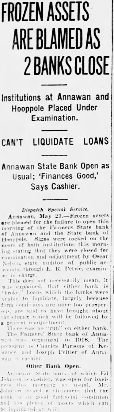Dispatch Special Service. Annawan. May 21.-Frozen assets blamed for the failure to open this morning of the Farmers State bank of Annawan and the State bank of Hooppole Signs were tacked on the doors of both institutions this morn ing stating that they were closed for examination and adjustment by Oscar Nelson, state auditor of public accounts. through E. R. Petrie, examincharge This not necessarily mean, it explained. that either bank is "broke Loans which the banks were unable to liquidate, largely because farm conditions are none too prosper are said to have brought about elimax which will be followed by general readjustment There no "run" on either bank The Farmers' State bank of Anna wan organized in 1916. The president Charles Parsons of Ke wance and Joseph Peltier of Anna