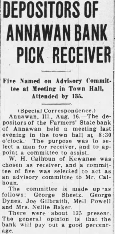 Aug. the Farmers' Annawan held meeting last evening the town hall at o'clock. The purpose was to lect man for receiver, and point committee to assist. Calhoun of Kewanee was chosen as receiver, and committee of five selected to act an advisory committee to Mr. Calhoun. The committee made follows: George Sheetz. George Joe Meil and Nellie Baker There about 135 present. The general opinion that the bank will pay out good percentage.